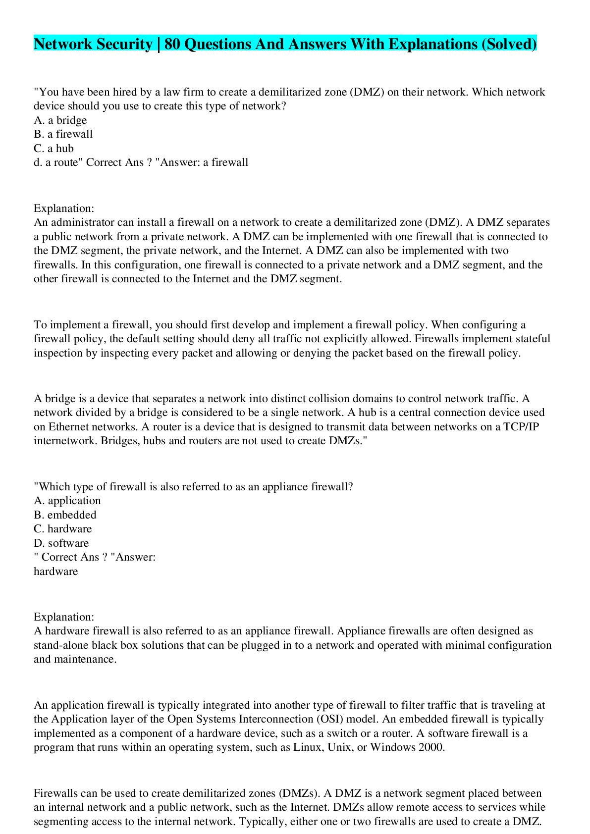 Computer Science > EXAM > Network Security | 80 Questions And Answers With Explanations (Solved) (All)