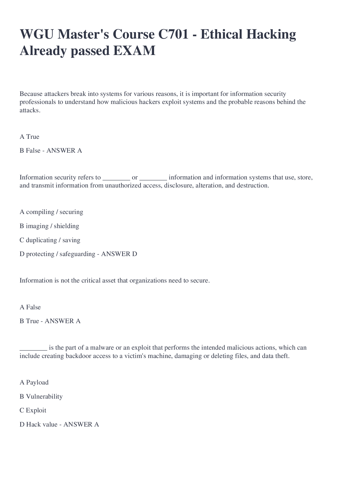 Computer Science > EXAM > WGU Master's Course C701 - Ethical Hacking Already passed EXAM (All)
