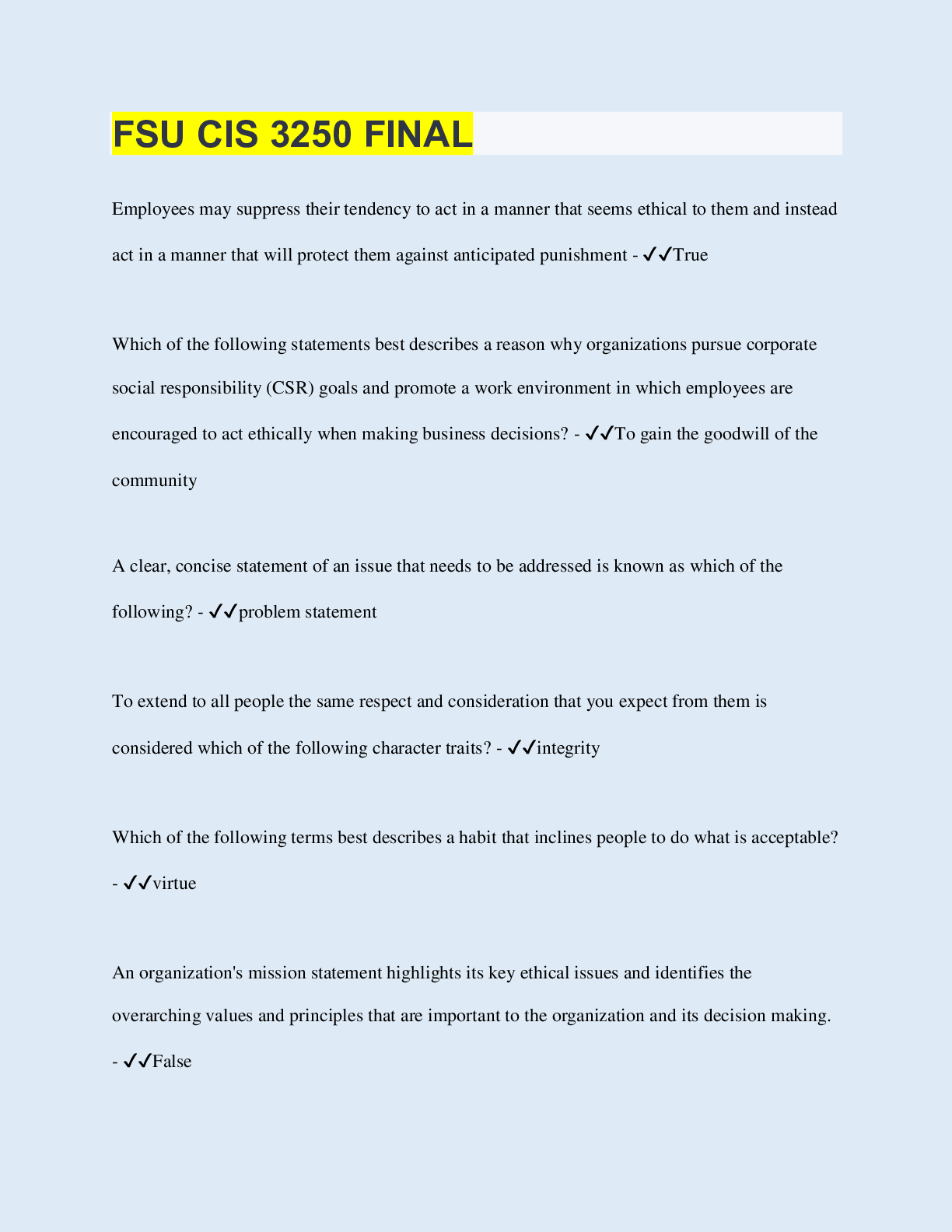Computer Science > QUESTIONS & ANSWERS > FSU CIS 3250 FINAL | 360 Questions with 100% Correct Answers | Updated 2023 | 53 Pages (All)