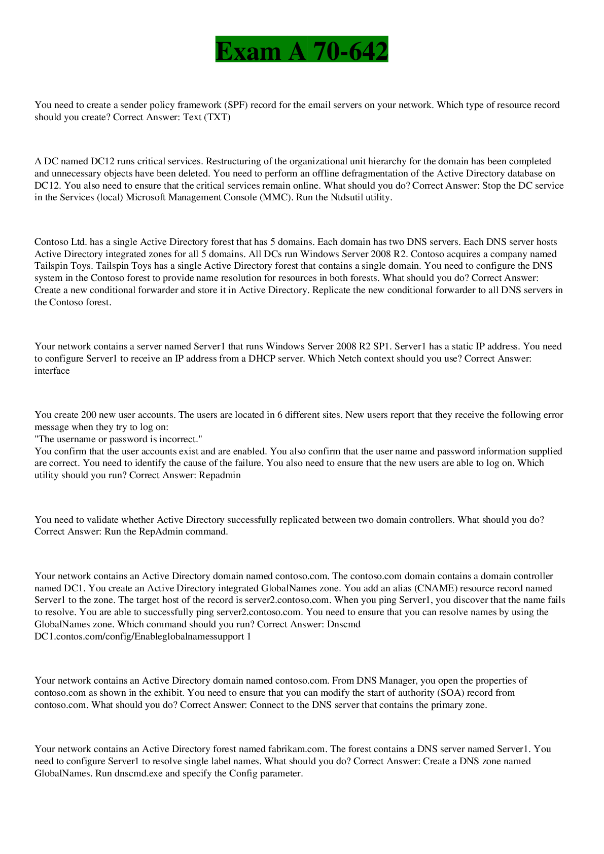 Computer Science > EXAM > Exam A 70-642 questions and answers all correct (All)