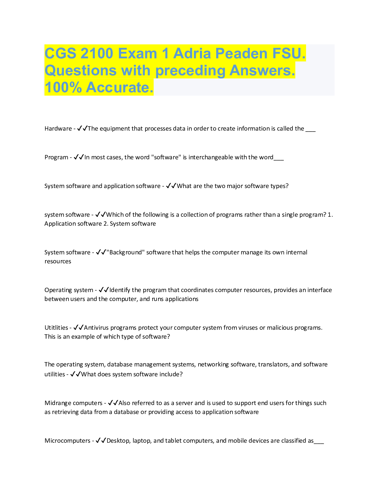 Computer Science > QUESTIONS & ANSWERS > CGS 2100 Exam 1 Adria Peaden FSU. Questions with preceding Answers. 100% Accurate. (All)