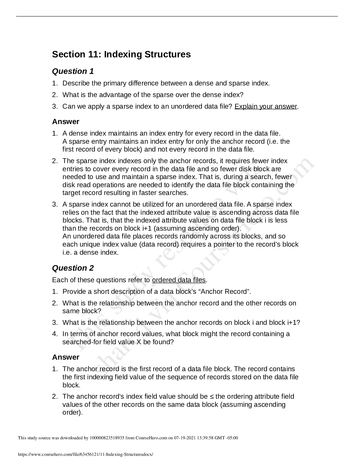 Computer Science > QUESTIONS & ANSWERS > Richland CollegeSCHOOL OF COSC 243611 Indexing Structures (All)