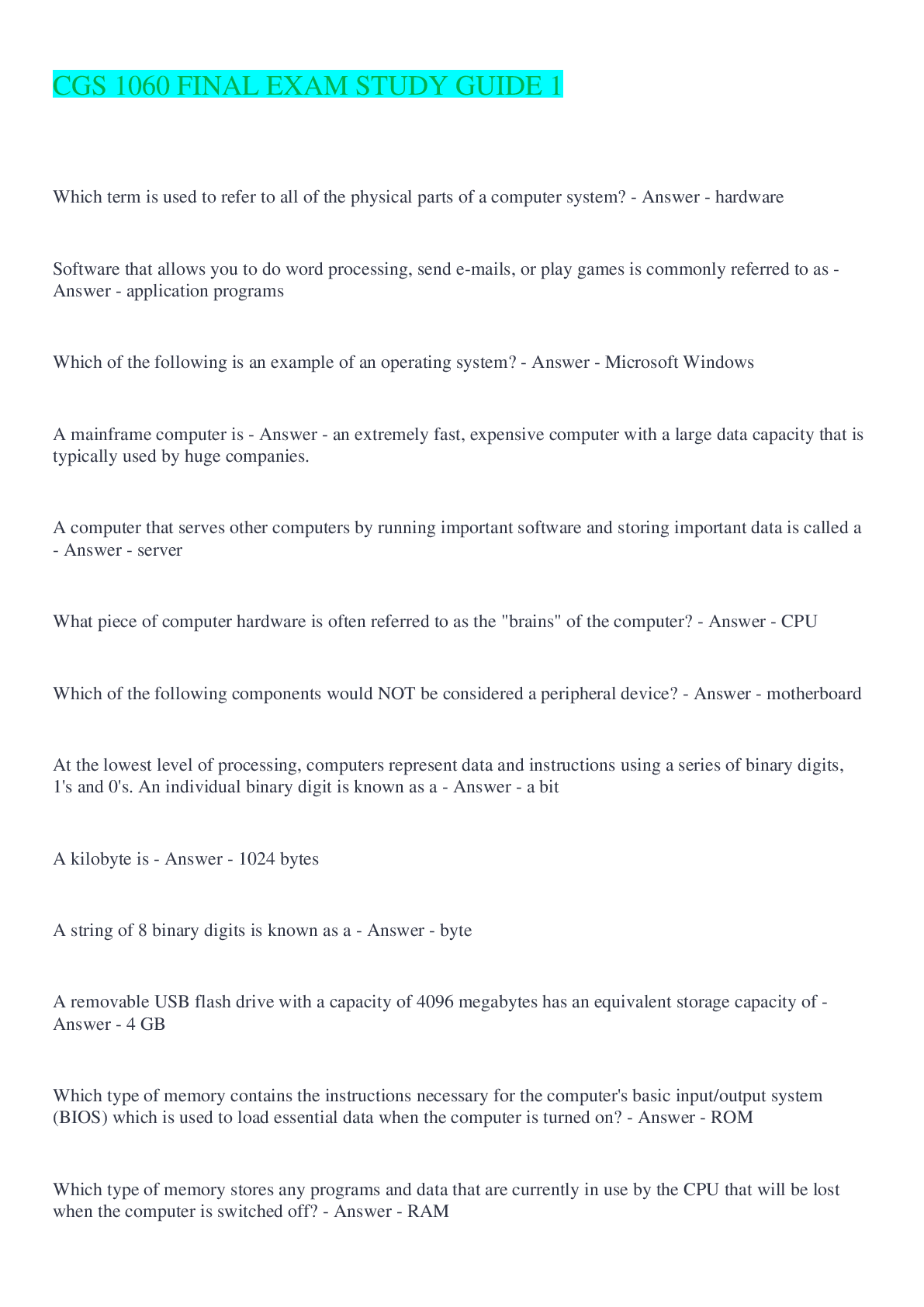 Computer Science > EXAM > CGS 1060 FINAL EXAM STUDY GUIDE 1 Questions With Answers 2022/2023 (All)
