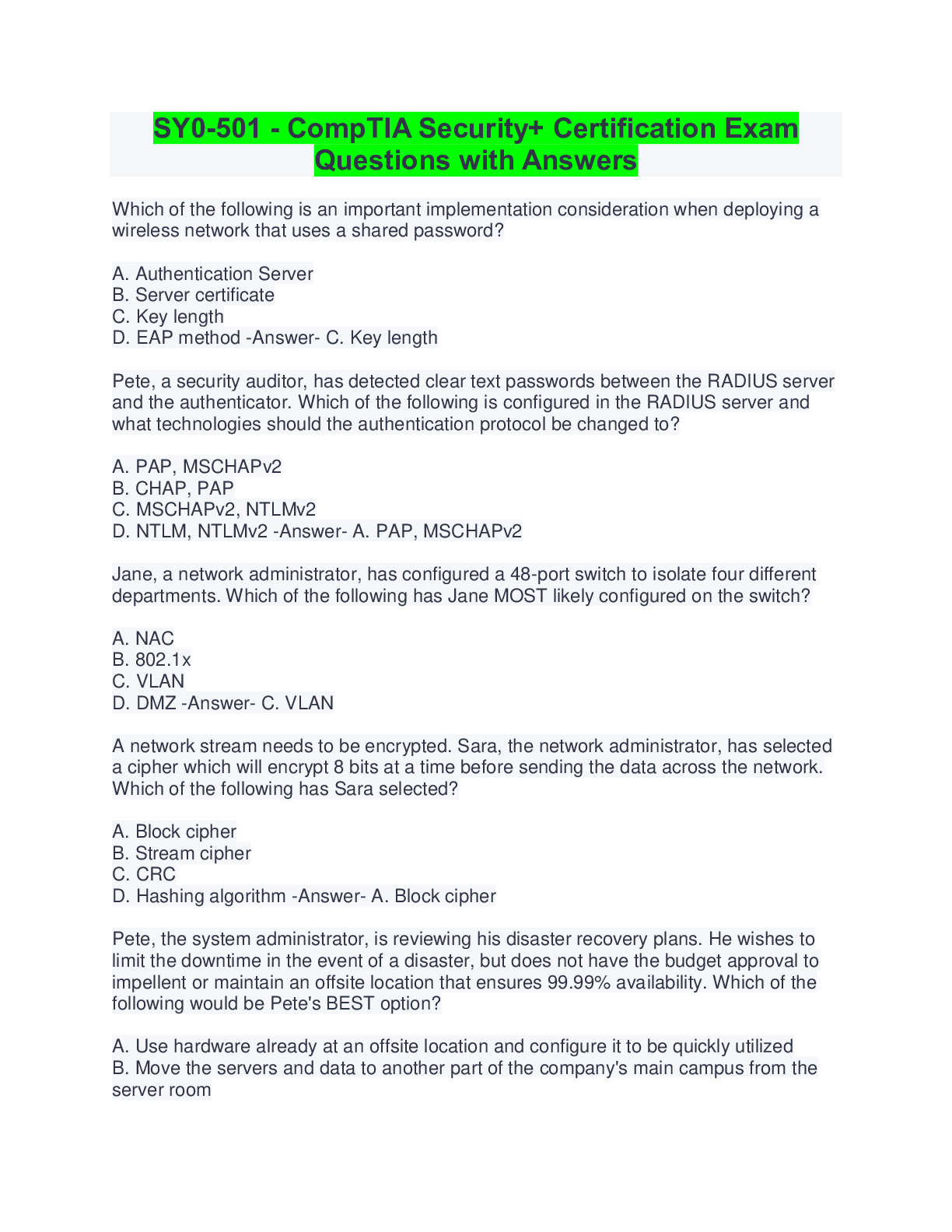 Computer Science > QUESTIONS & ANSWERS > SY0-501 - CompTIA Security+ Certification Exam Questions with Answers (All)