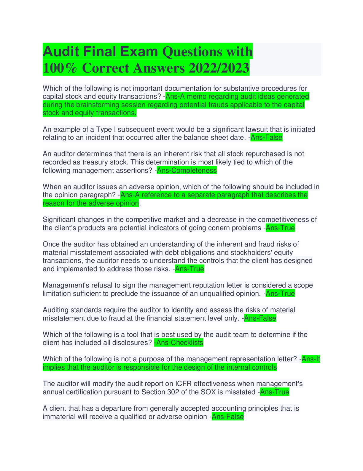 Computer Science > QUESTIONS & ANSWERS > Audit Final Exam Questions with 100% Correct Answers 2022/2023 (All)