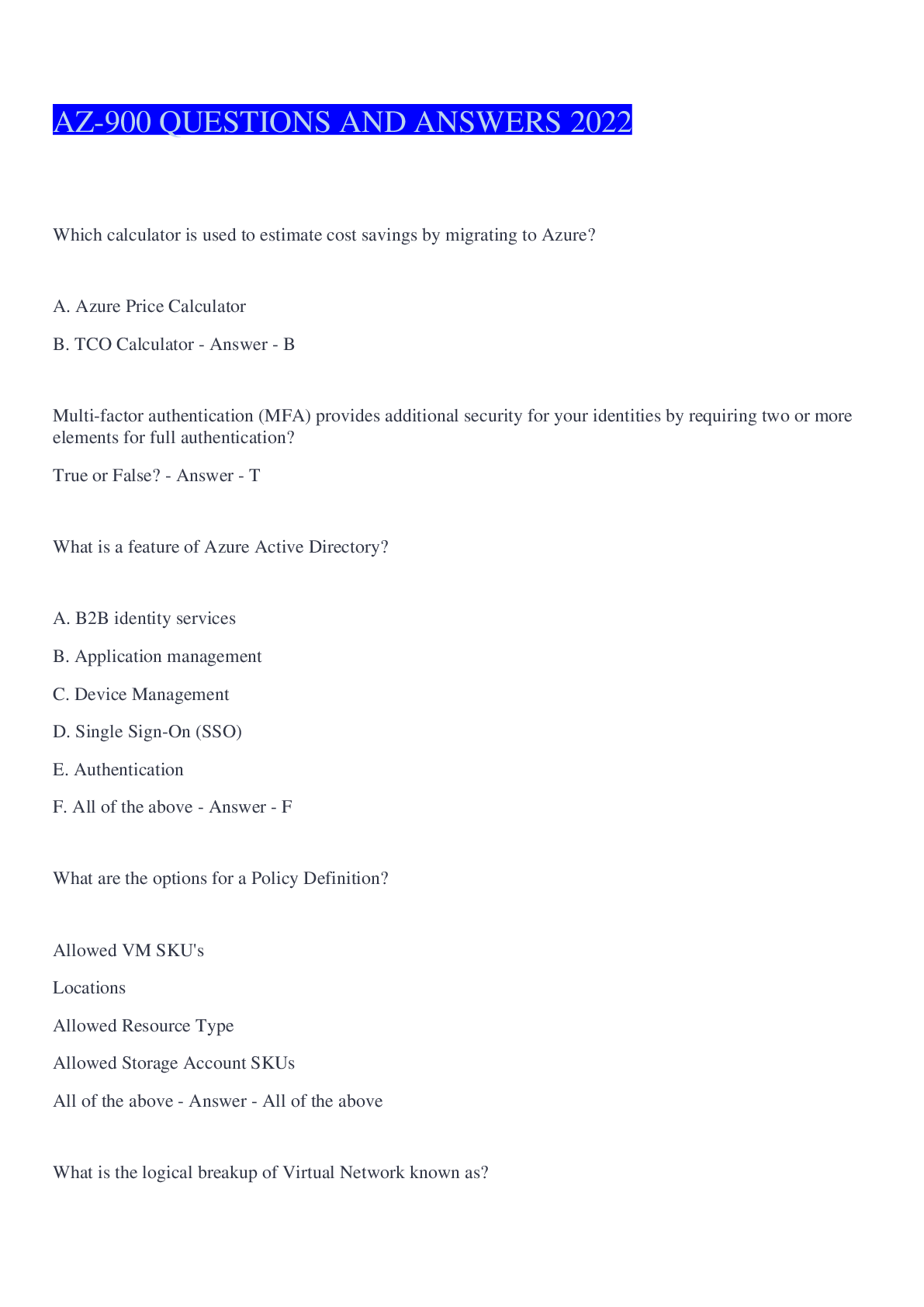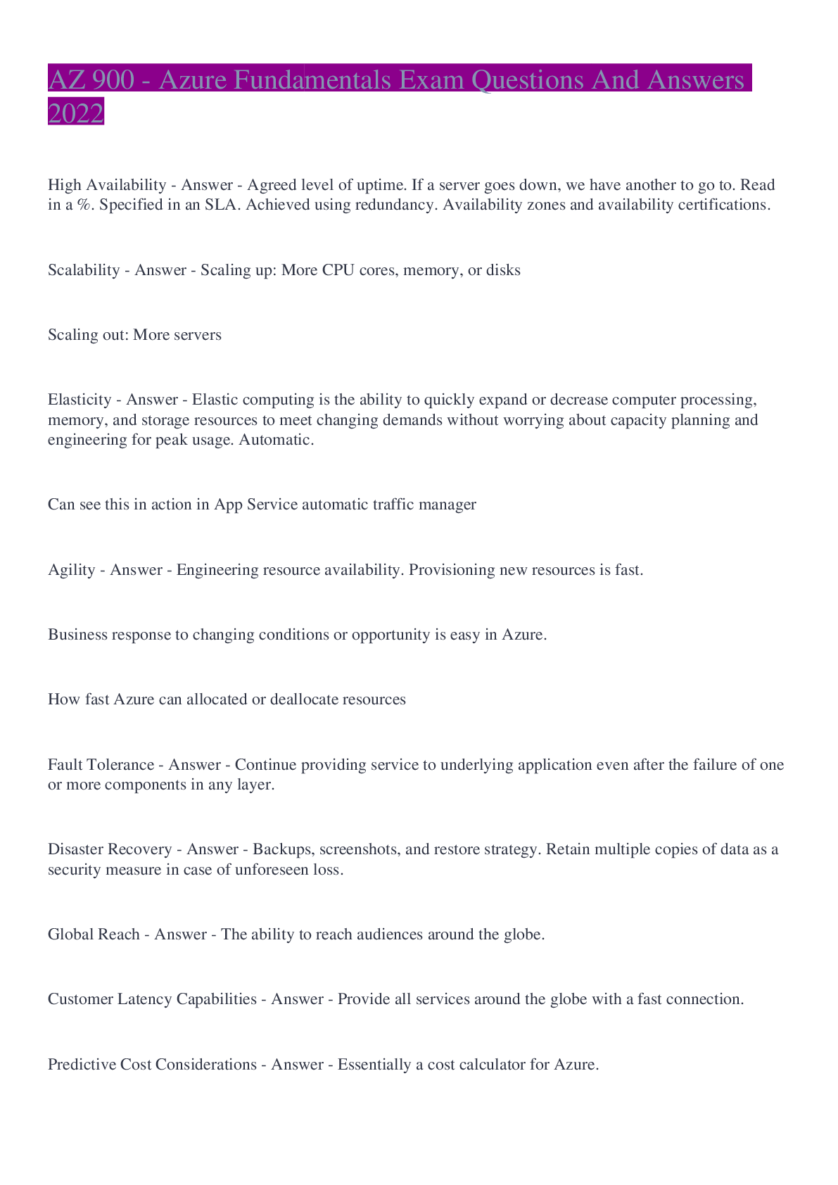 Computer Science > EXAM > AZ 900 - Azure Fundamentals Exam Questions And Answers 2022 (All)