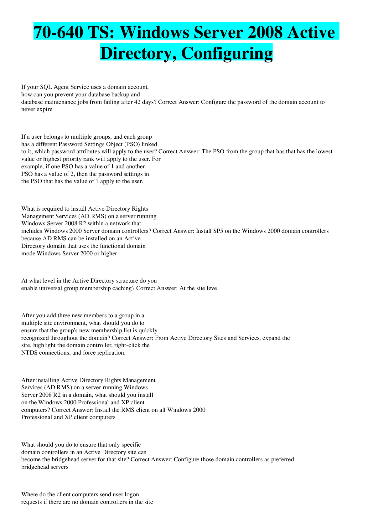 Computer Science > EXAM > 70-640 TS: Windows Server 2008 Active Directory, Configuring (All)