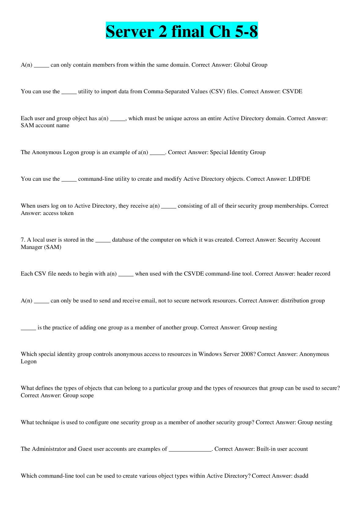 Computer Science > EXAM > Server 2 final Ch 5-8 QUESTIONS AND ANSWERS ALL CORRECT (All)