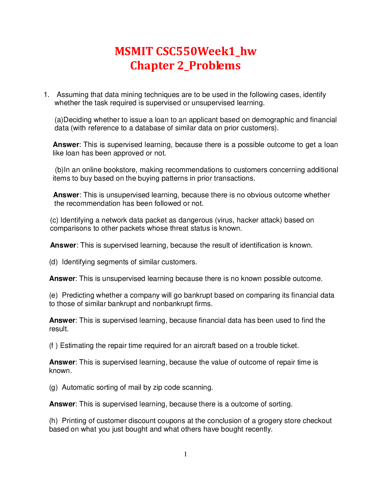 Data Mining > QUESTIONS & ANSWERS > MSMIT CSC550 Week1_hw Chapter 2_Problems. All Answers Provided. (All)