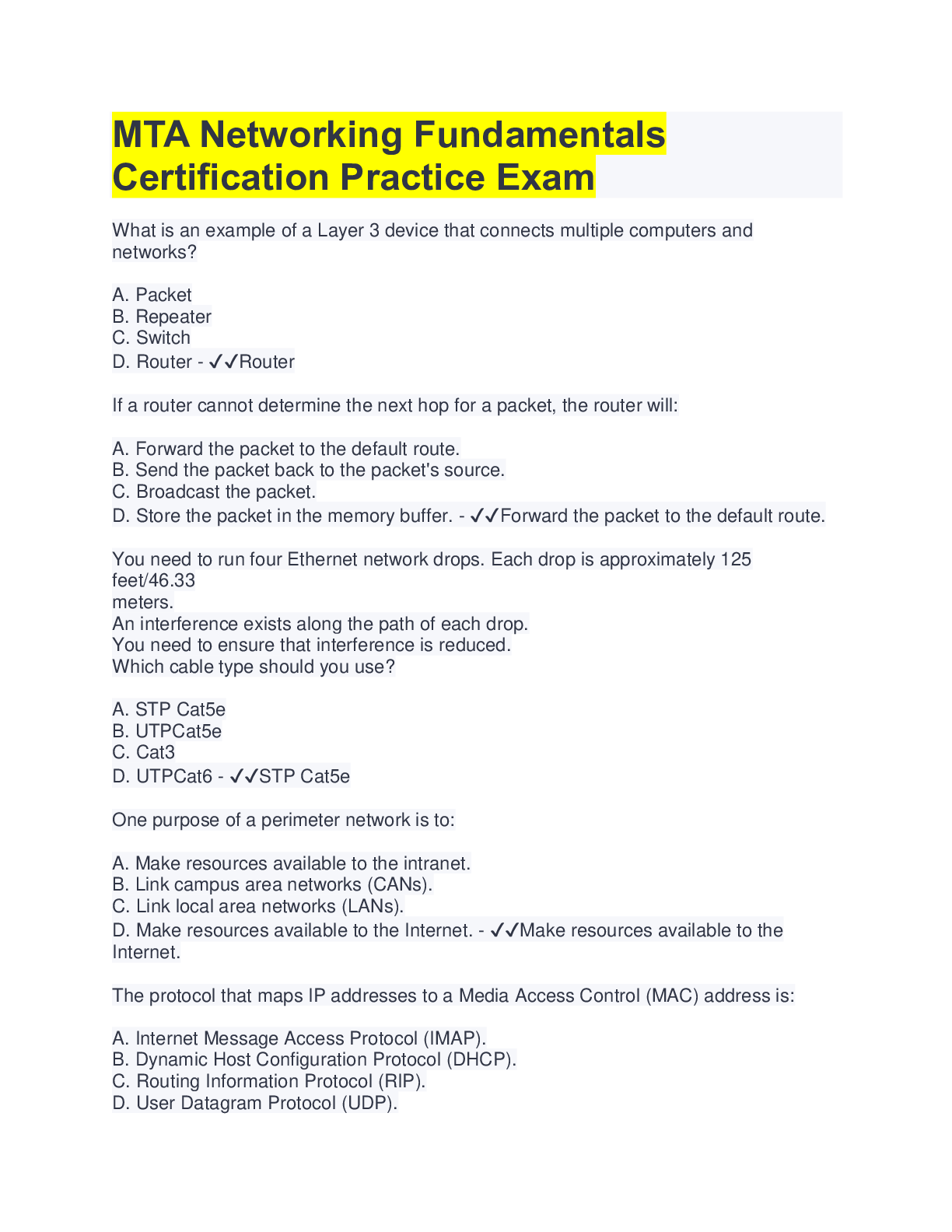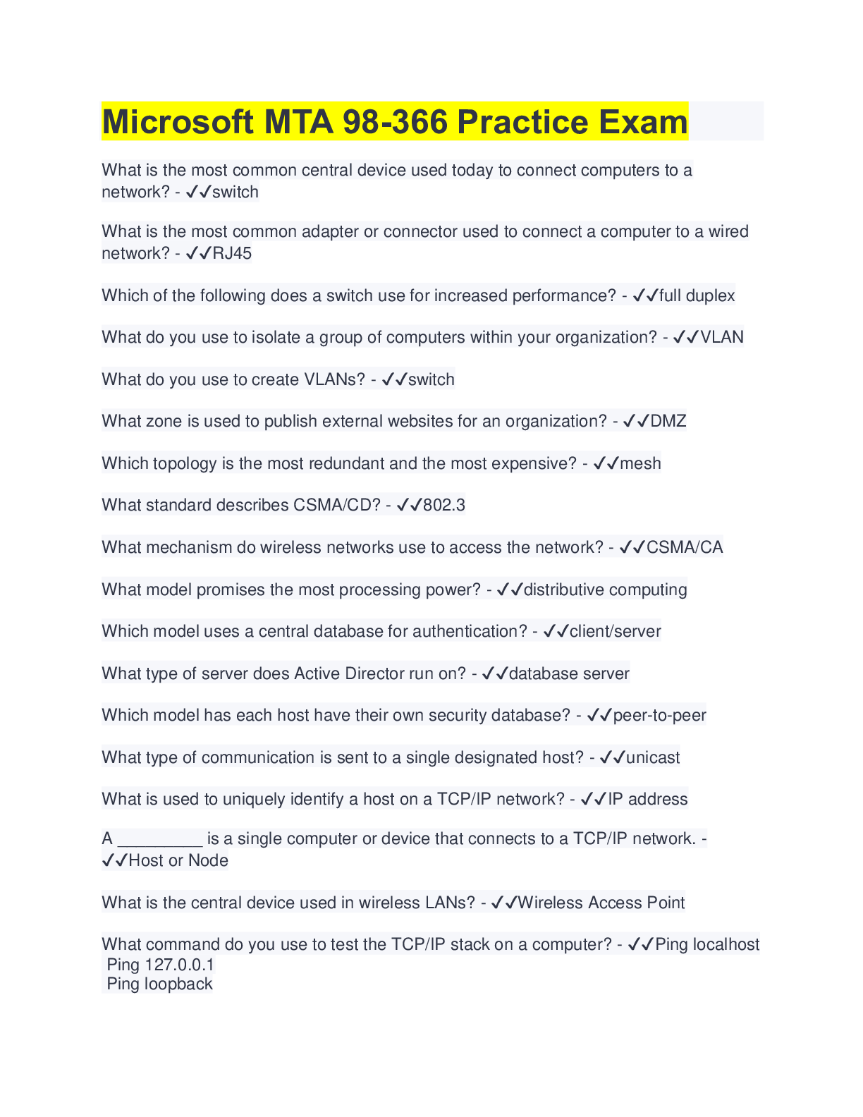 Computer Architecture > QUESTIONS & ANSWERS > MTA Networking Fundamentals Certification Practice Exam(QUESTIONS & ANSWERS) (All)
