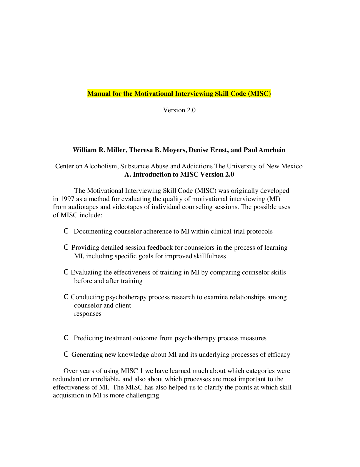 Economics and Statistics > STUDY GUIDE > Manual for the Motivational Interviewing Skill Code (MISC) Version 2.0 (All)