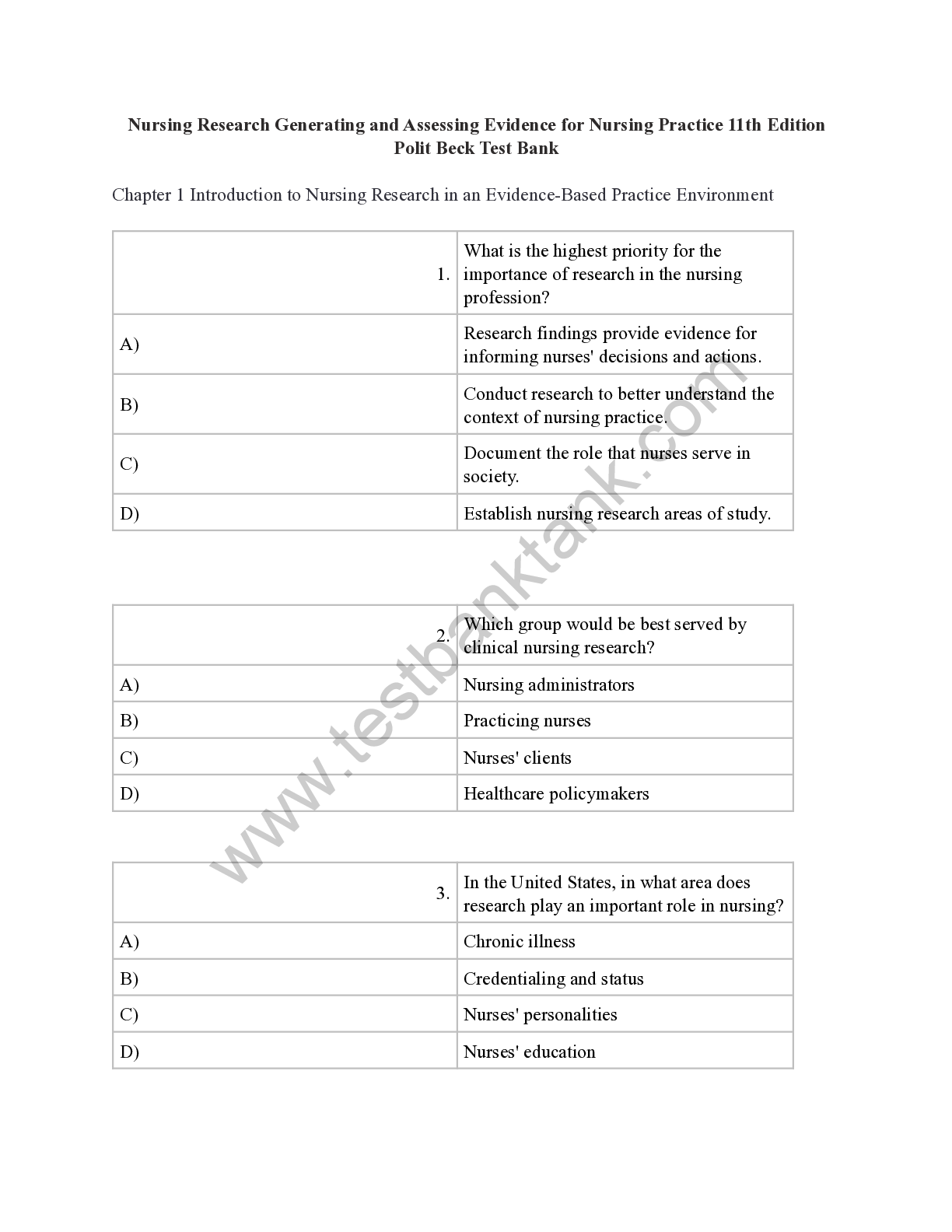SCIENCE 101 > TEST BANKS > Nursing Research Generating and Assessing Evidence for Nursing Practice 11th Edition By Denise Polit, Cheryl Beck (Test Bank All Chapters, 100% Original Verified, A+ Grade) (All)