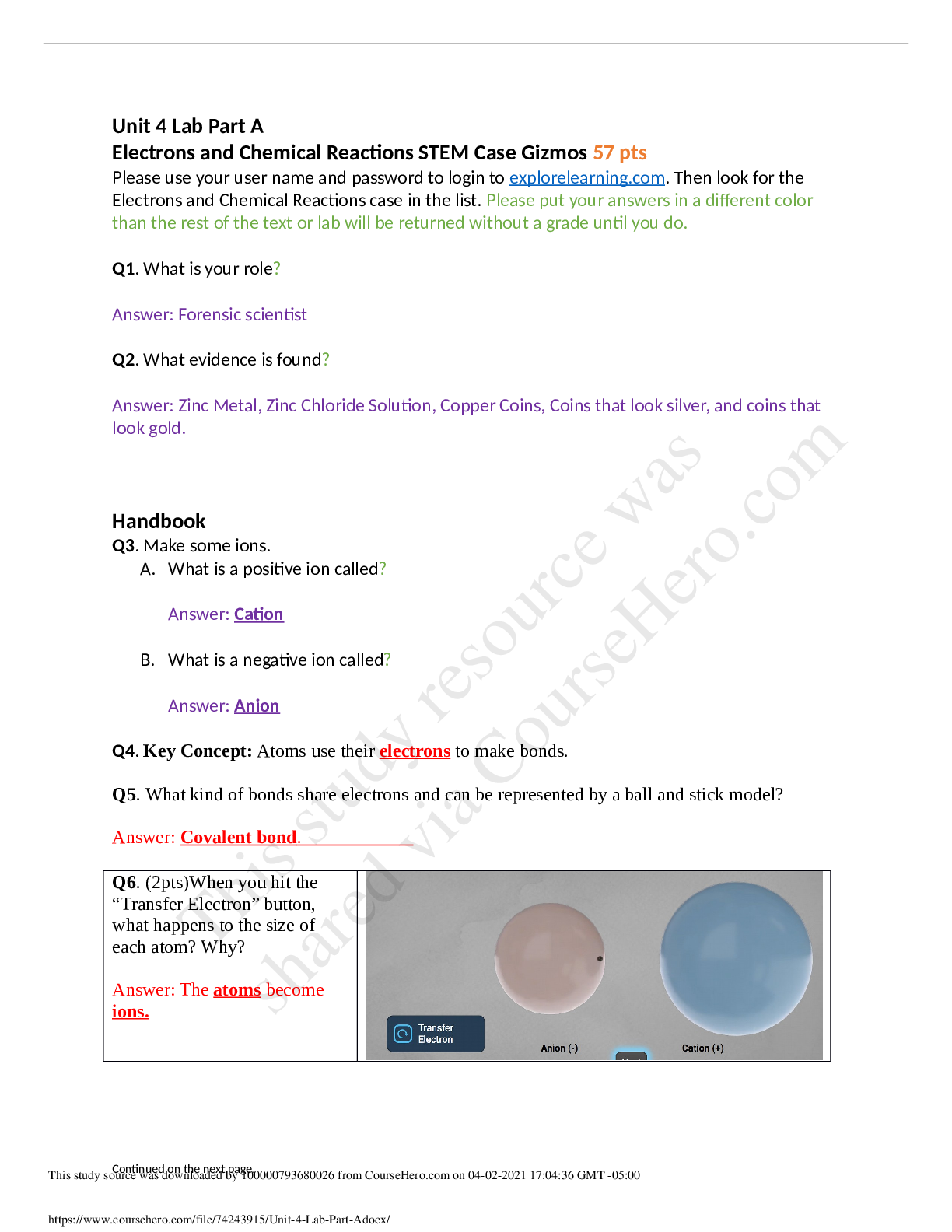 SCIENCE 101 > Lab Report > SCIENCE 101Unit 4 Lab Part A.>electrons and Chemical Reactions STEM Case Gizmos 57 pts (with answers) (All)