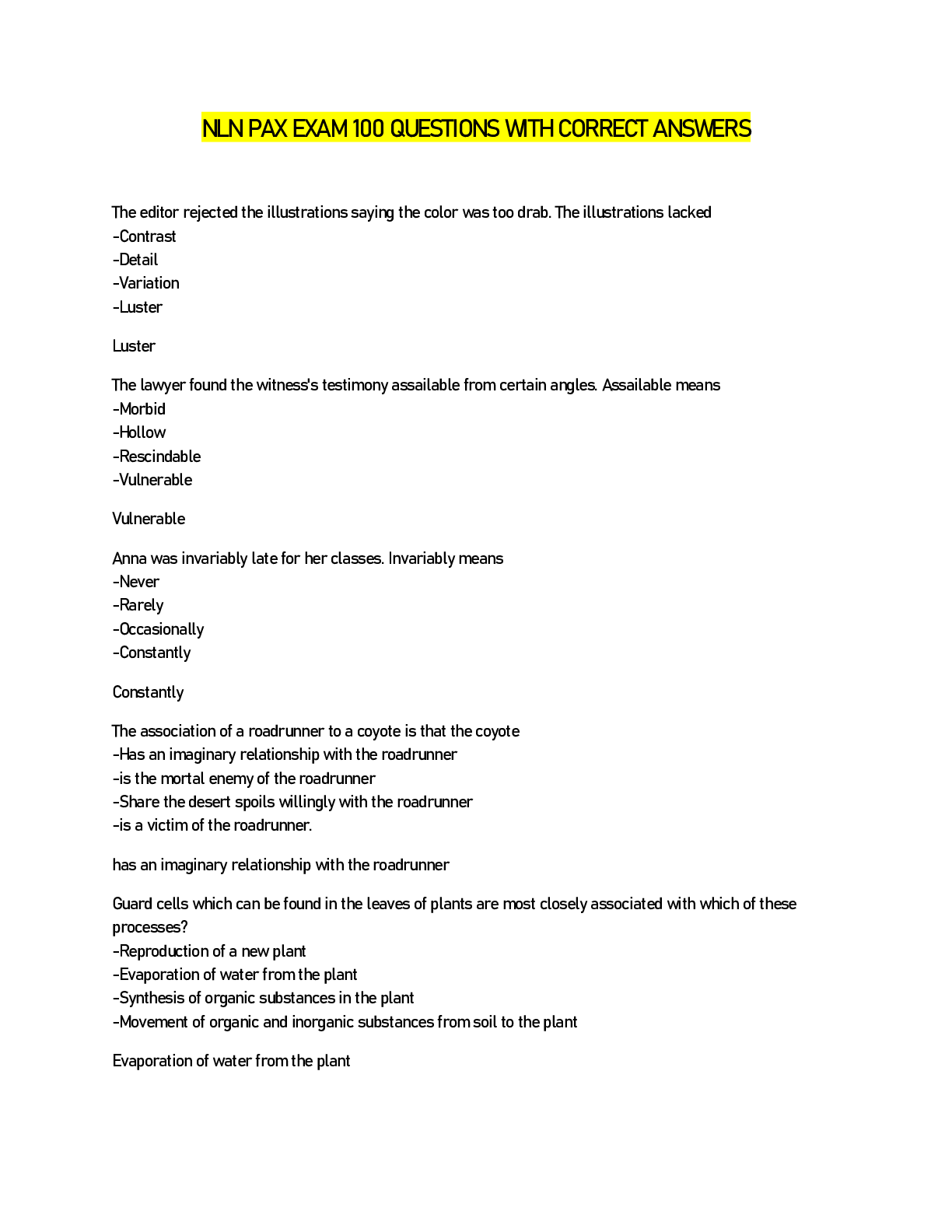 SCIENCE 101 > EXAM > NLN PAX EXAM 100 QUESTIONS WITH CORRECT ANSWERS (All)