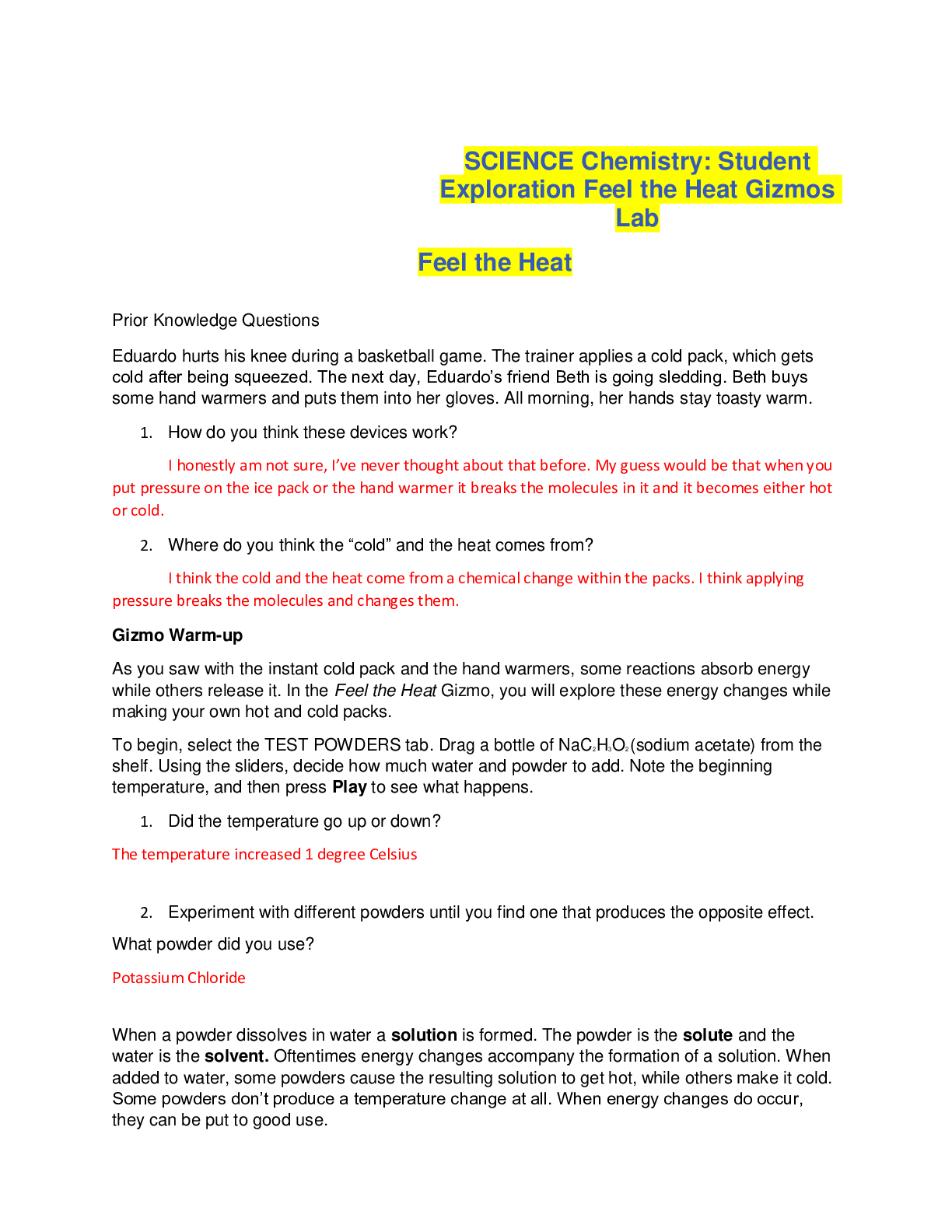 SCIENCE 101 > QUESTIONS & ANSWERS > University High, Irvine; SCIENCE Chemistry: Student Exploration Feel the Heat Gizmos Lab (All)