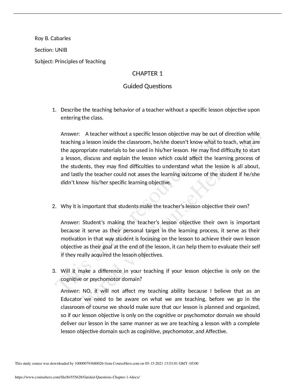 SCIENCE 101 > QUESTIONS & ANSWERS > Subject: Principles of Teaching CHAPTER 1 Guided Questions (All)