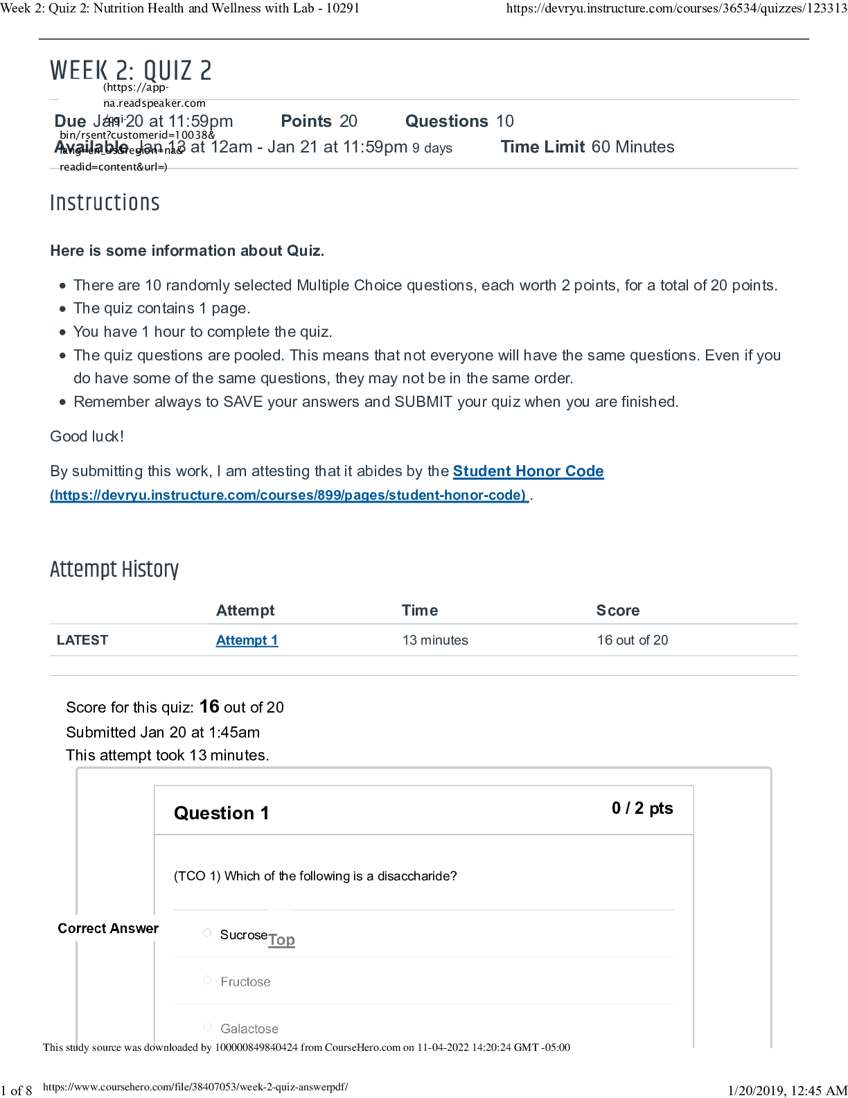 SCIENCE 101 > QUESTIONS & ANSWERS > SCI 228 Week 1 Quiz: Nutrition, Health, and Wellness with Lab (Jan 2020-v2) (All)