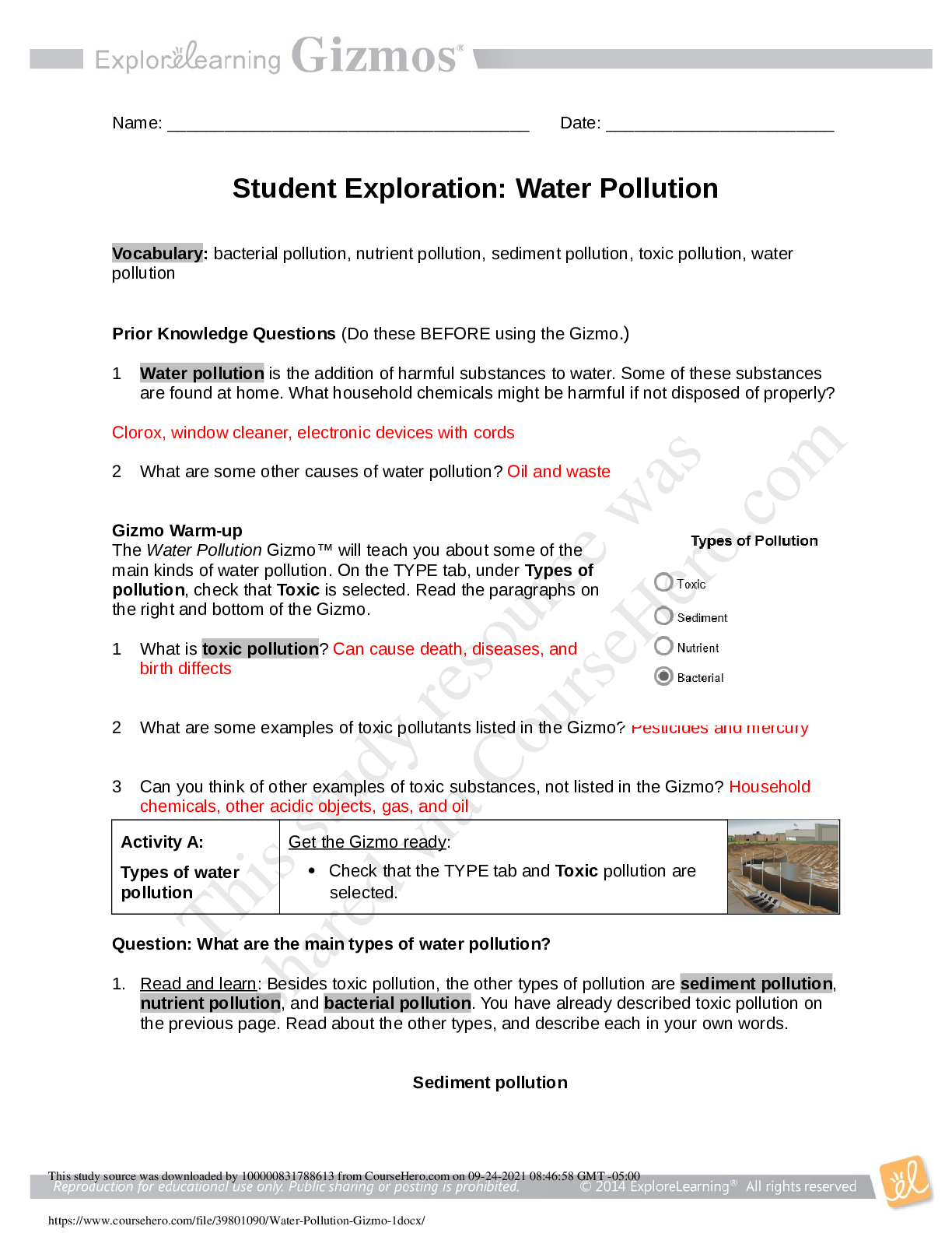 SCIENCE 101 > QUESTIONS & ANSWERS > Gizmo Water Pollution _2021 | Student Exploration: Water Pollution | ALL ANSWERS CORRECT (All)
