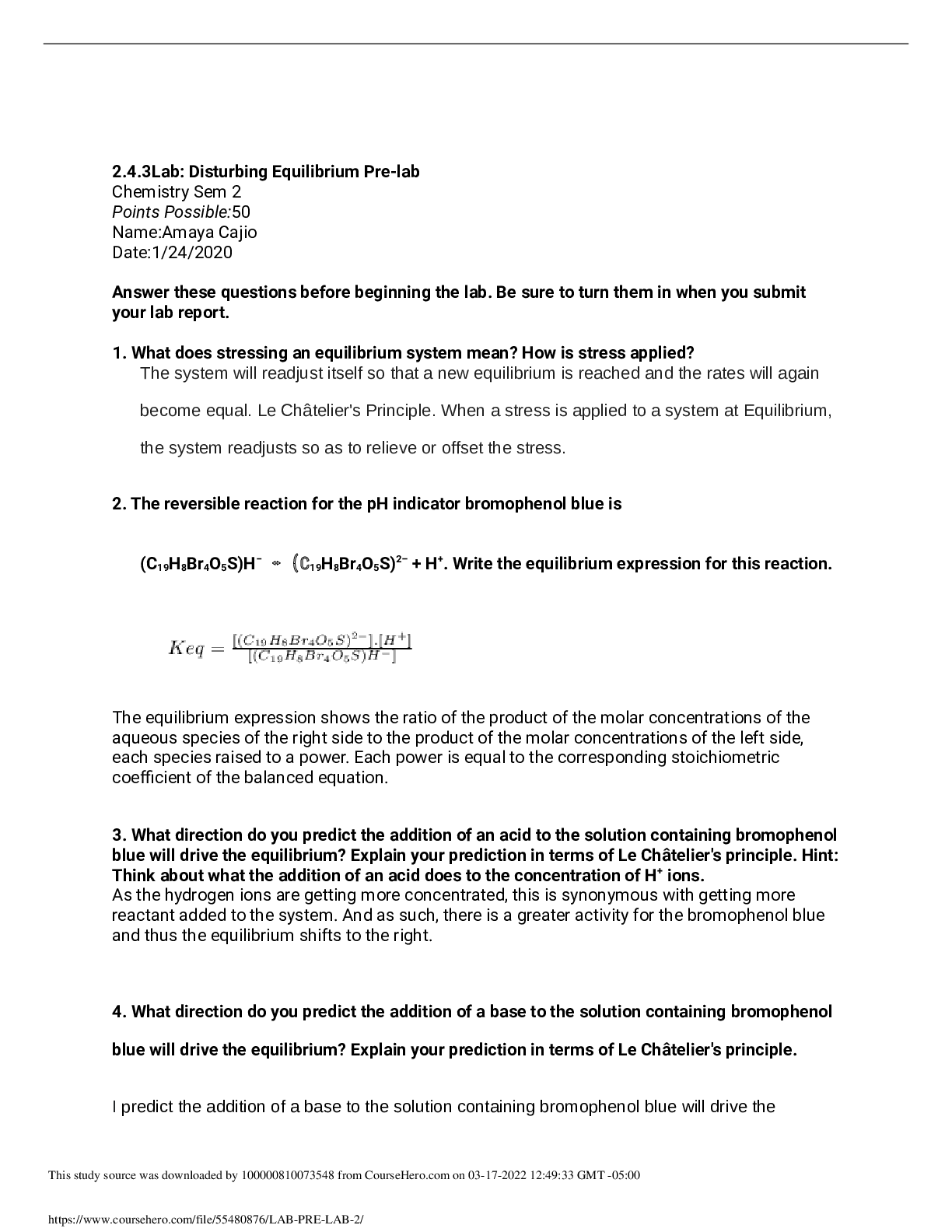 SCIENCE 101 > QUESTIONS & ANSWERS > 2.4.3Lab: Disturbing Equilibrium Pre-lab Chemistry Sem 2 Points Possible:50. (All)