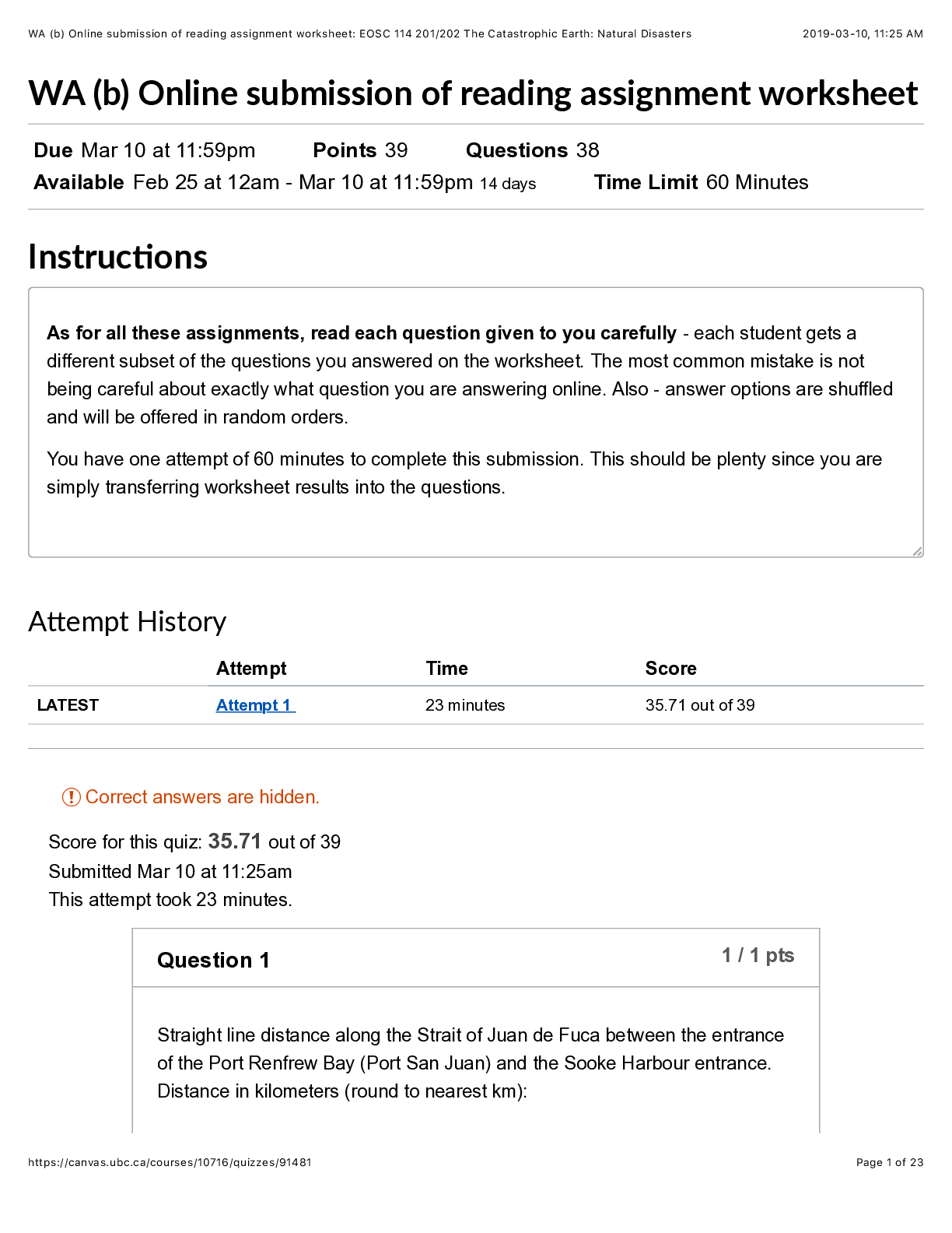 SCIENCE 101 > EXAM > Questions and Answers > University of British Columbia - EOSC 114waves-assignment. Quiz Score: 35.71 out of 39 (All)