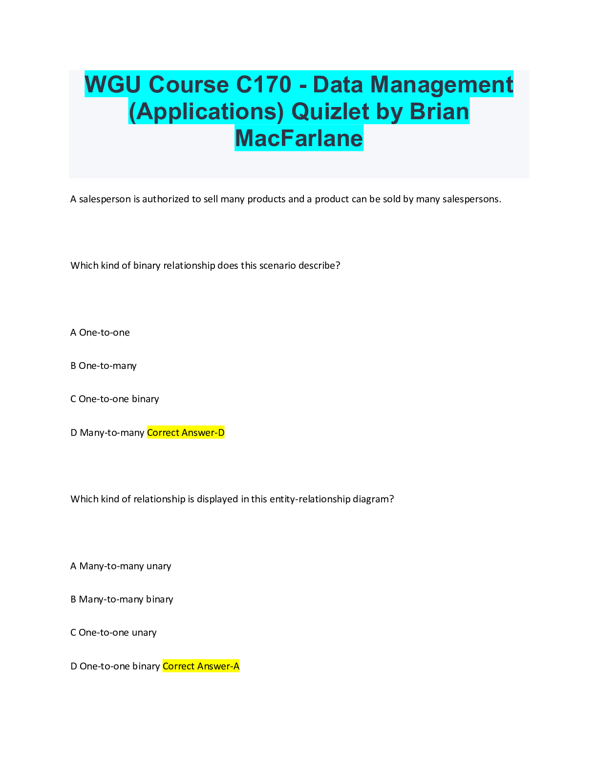 Database Management > QUESTIONS & ANSWERS > WGU Course C170 - Data Management (Applications) Quizlet by Brian MacFarlane (All)
