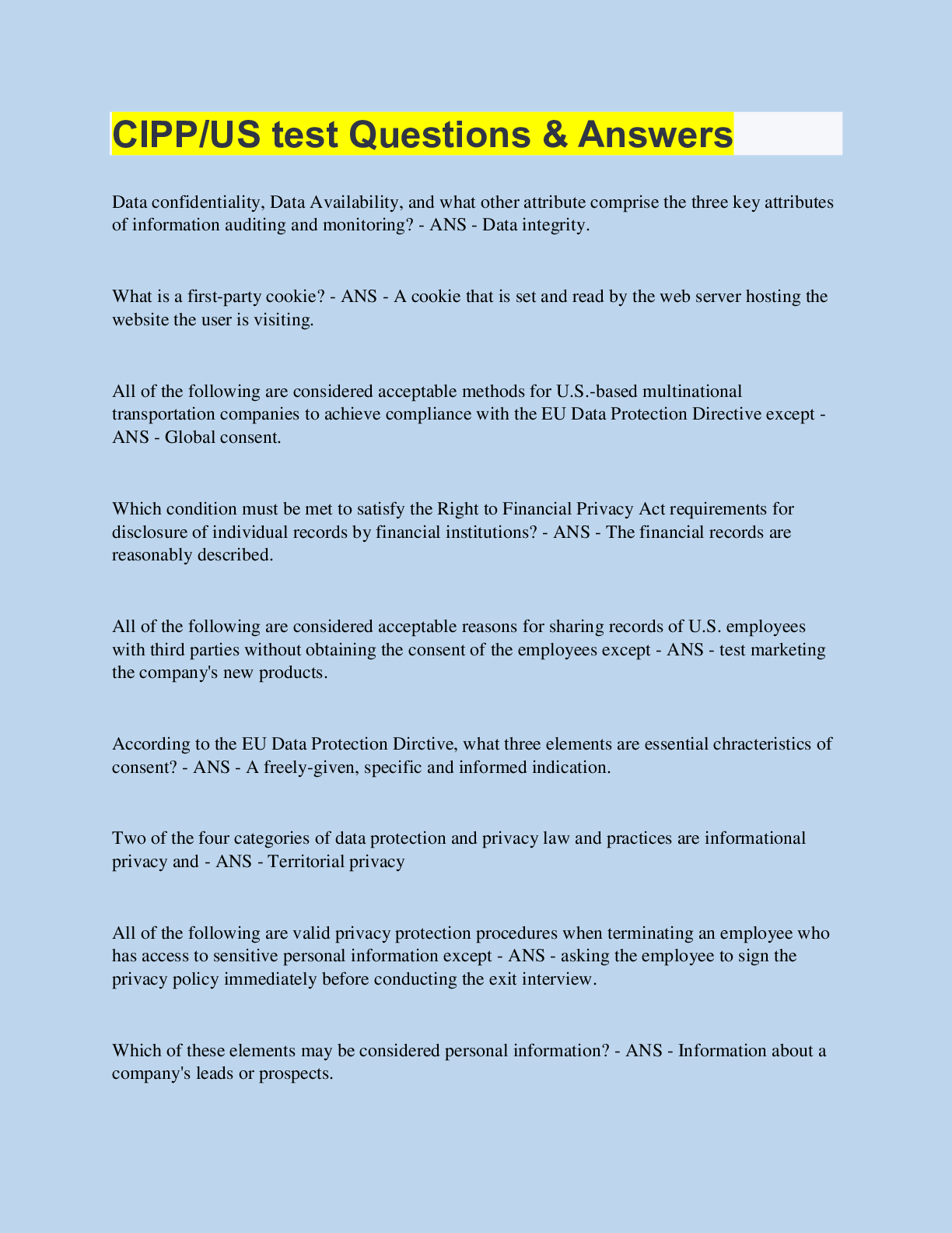 Database Management > QUESTIONS & ANSWERS > CIPP/US test Questions & Answers (All)