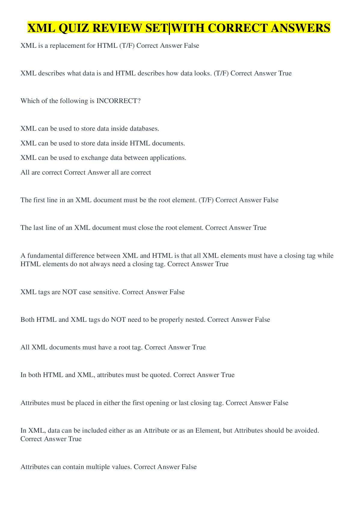 Database Management > QUESTIONS & ANSWERS > XML QUIZ REVIEW SET|WITH CORRECT ANSWERS (All)
