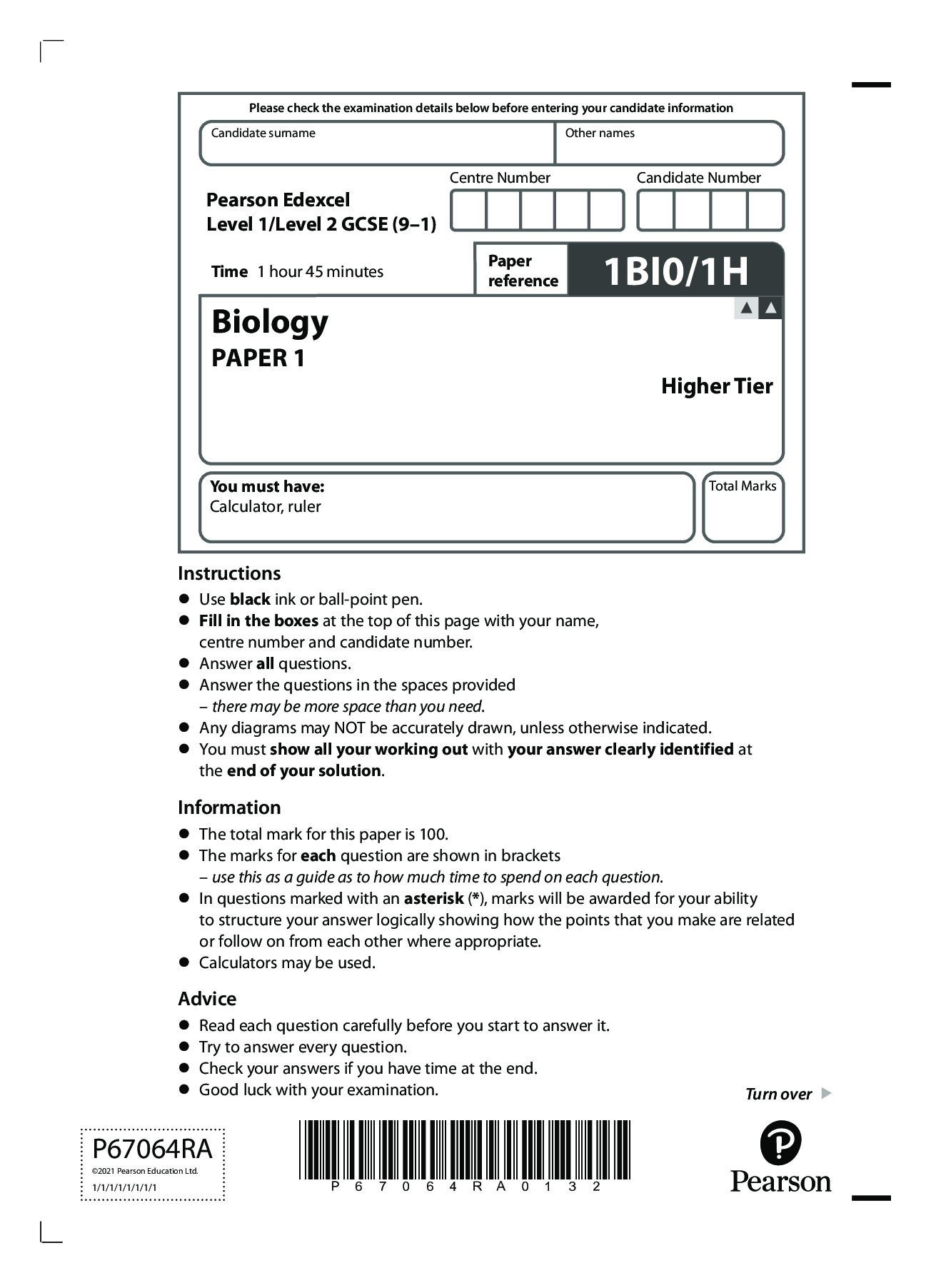 Combined Science: Trilogy > GCSE QUESTION PAPER > Pearson Edexcel_GCSE (9–1) Biology_1BI0/1H Question Paper 2021 | Paper 1 (All)