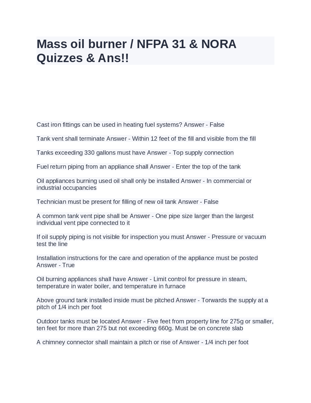 Engineering > QUESTIONS and ANSWERS > NFPA 31 and NORA(National Oil Refiners Association) Quizzes & Answers!! (All)
