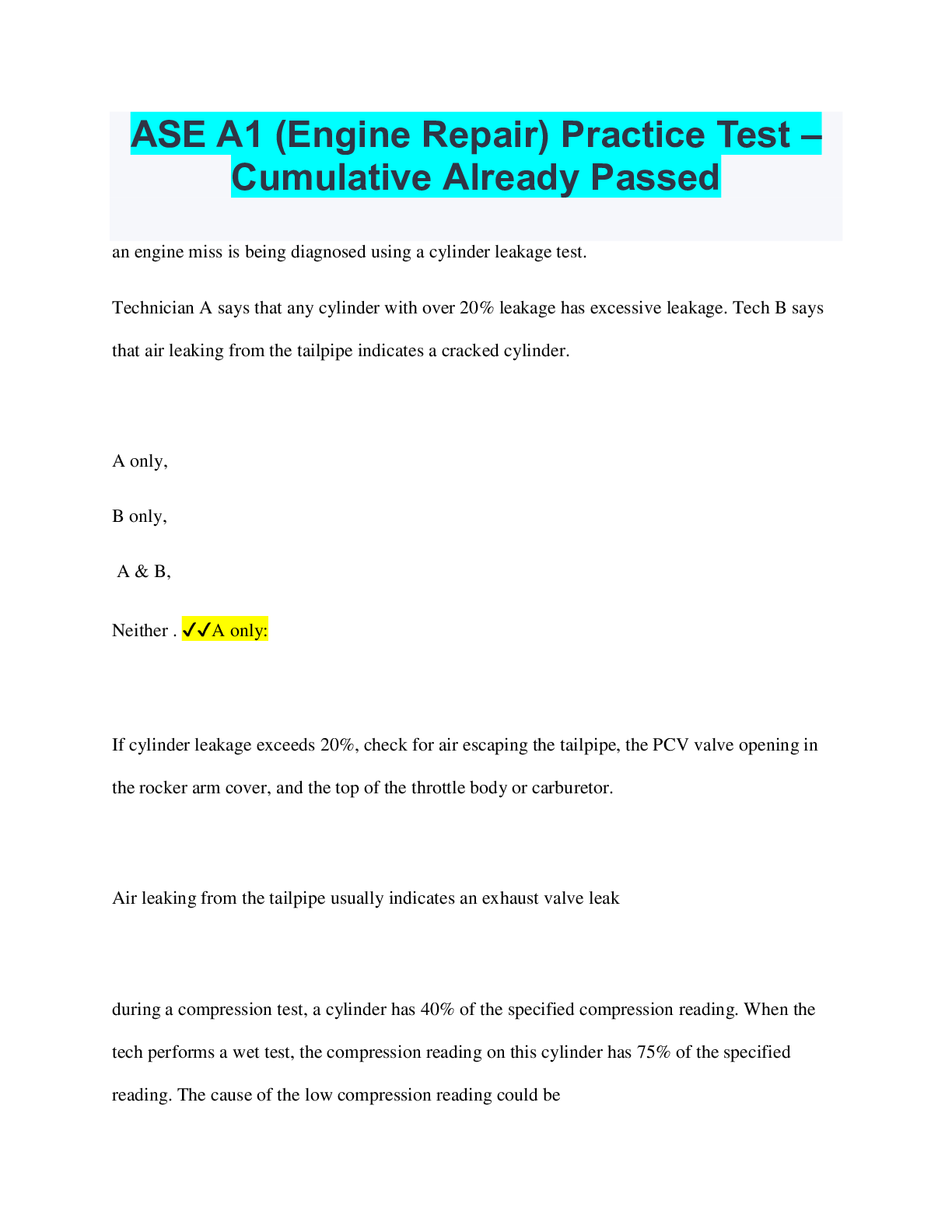 Engineering > QUESTIONS & ANSWERS > ASE A1 (Engine Repair) Practice Test – Cumulative Already Passed (All)