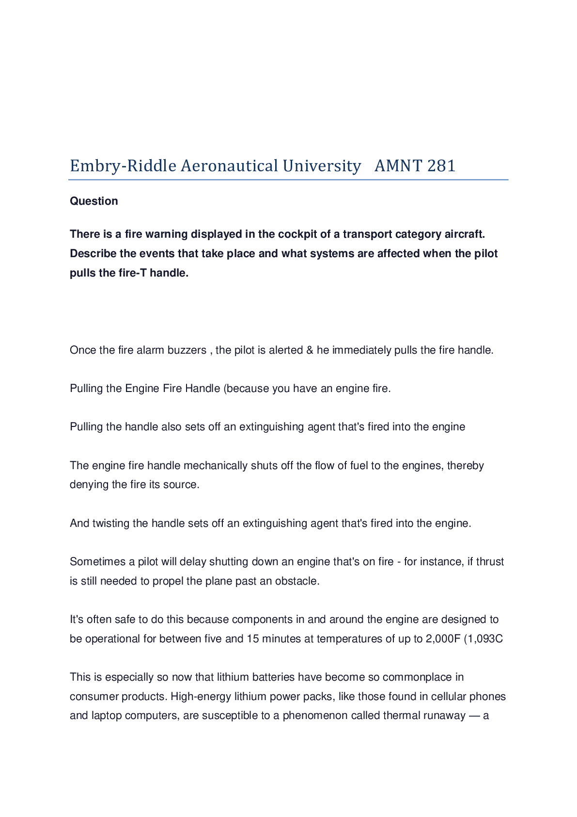 Engineering > QUESTIONS & ANSWERS > Questions and Answers > There is a fire warning displayed in the cockpit of a transport category aircraft. Describe the events that take place and what systems are affected when the pilot pulls the fire-T handle. (All)