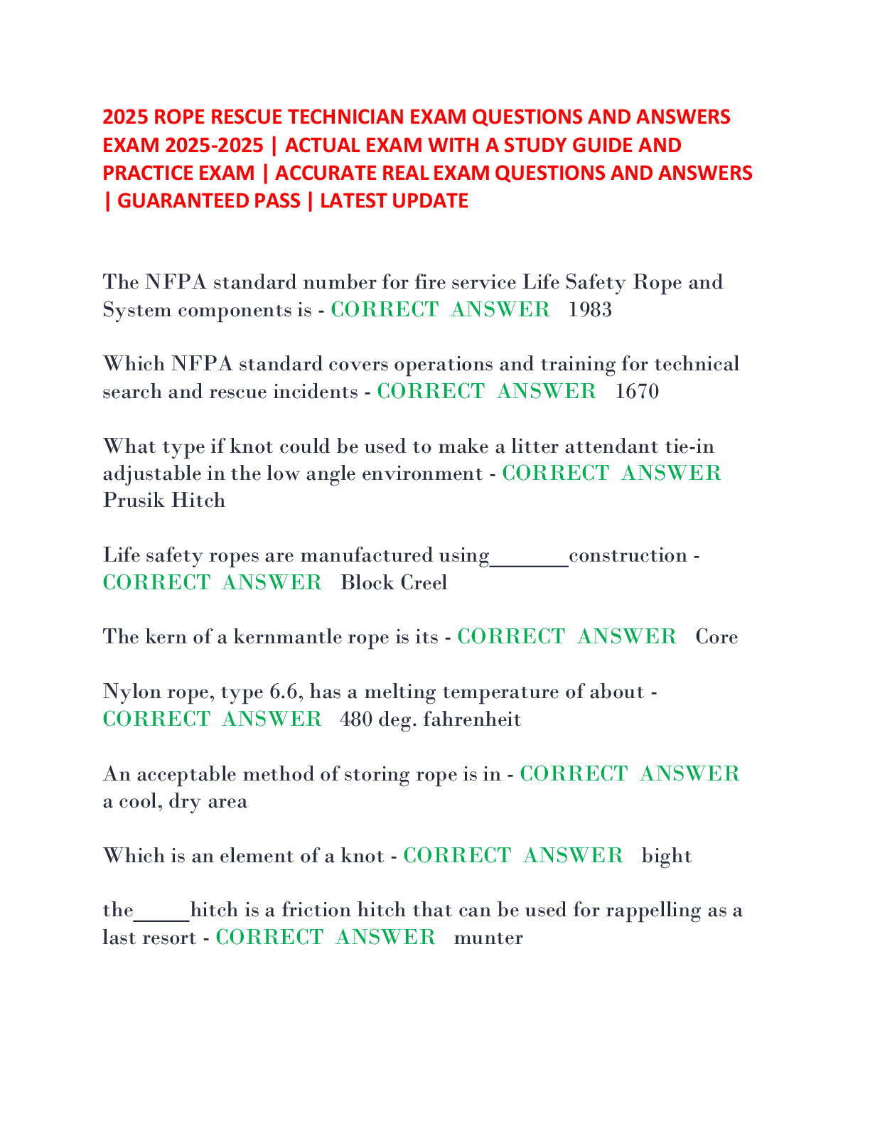 Engineering > EXAM > 2025 Rope Rescue Technician Exam Questions and Answers Exam 2025-2025 Actual Exam with a Study Guide and Practice Exam Accurate Real Exam Questions and Answers Guaranteed Pass Latest Update. (All)