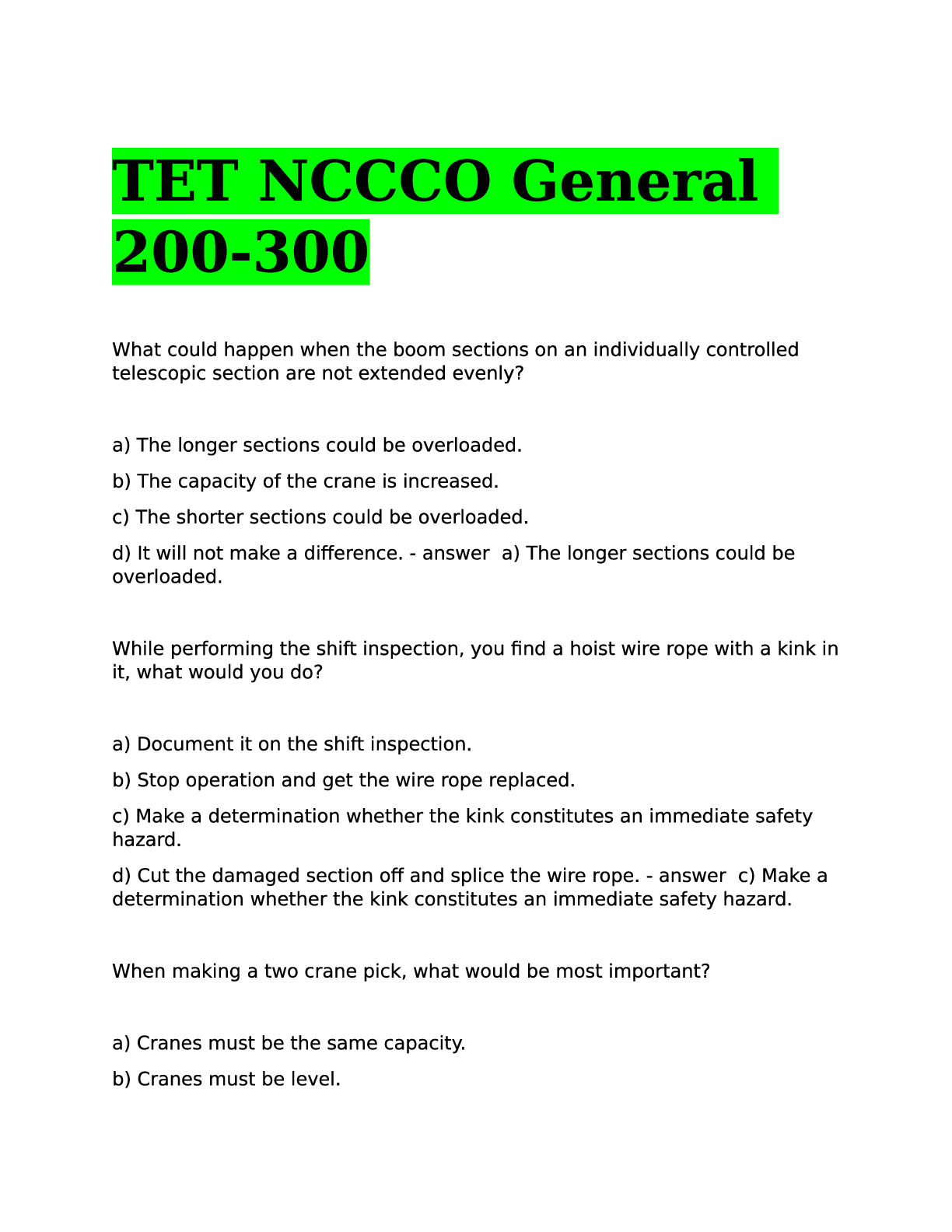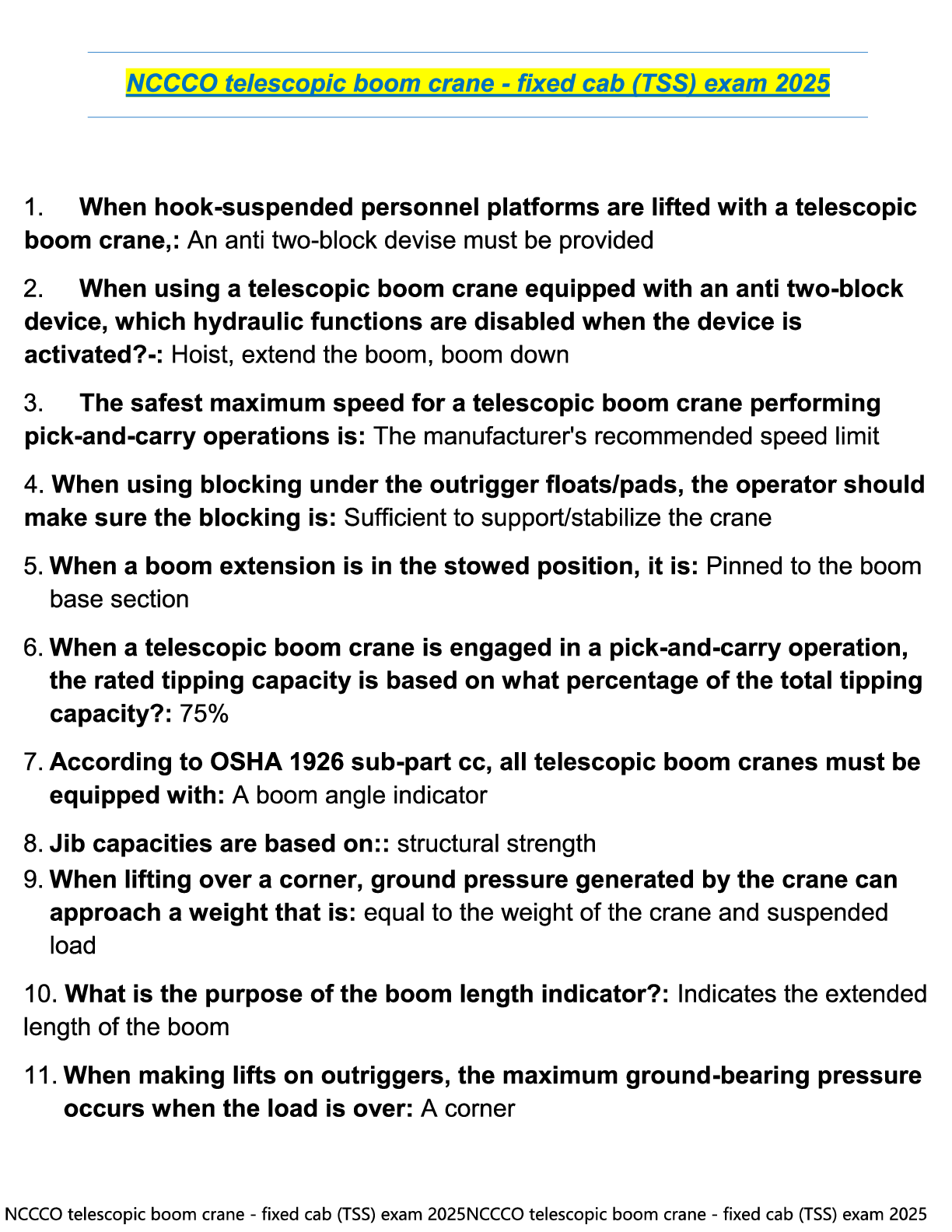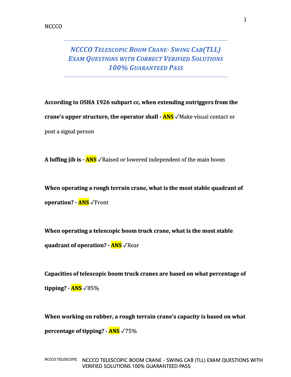 Engineering > EXAM > NCCCO TELESCOPIC BOOM CRANE - SWING CAB (TLL) EXAM QUESTIONS WITH VERIFIED SOLUTIONS 100% GUARANTEED PASS. (All)