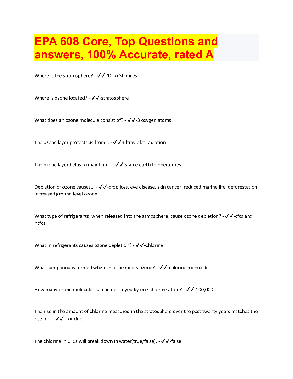 Engineering > EXAM > EPA 608 study material including (Core, type 1, 2 and 3) With Possible Questions and Answers (All)