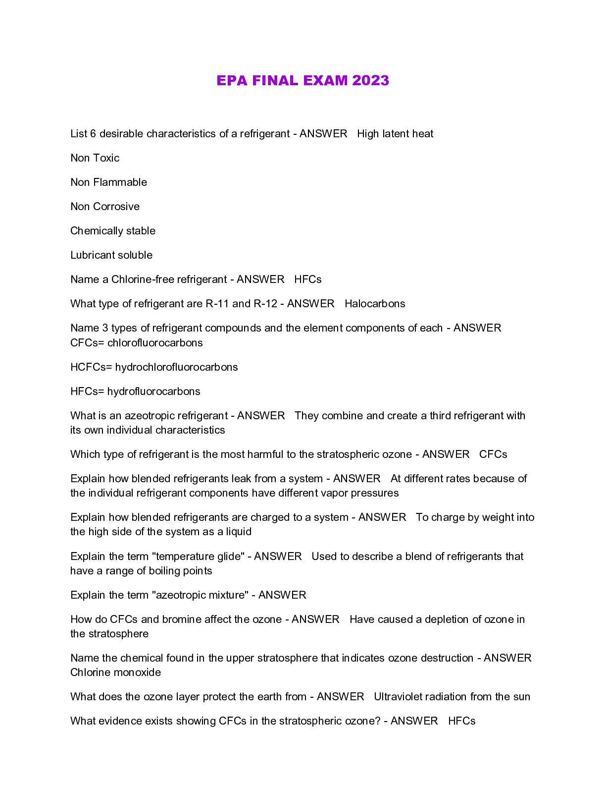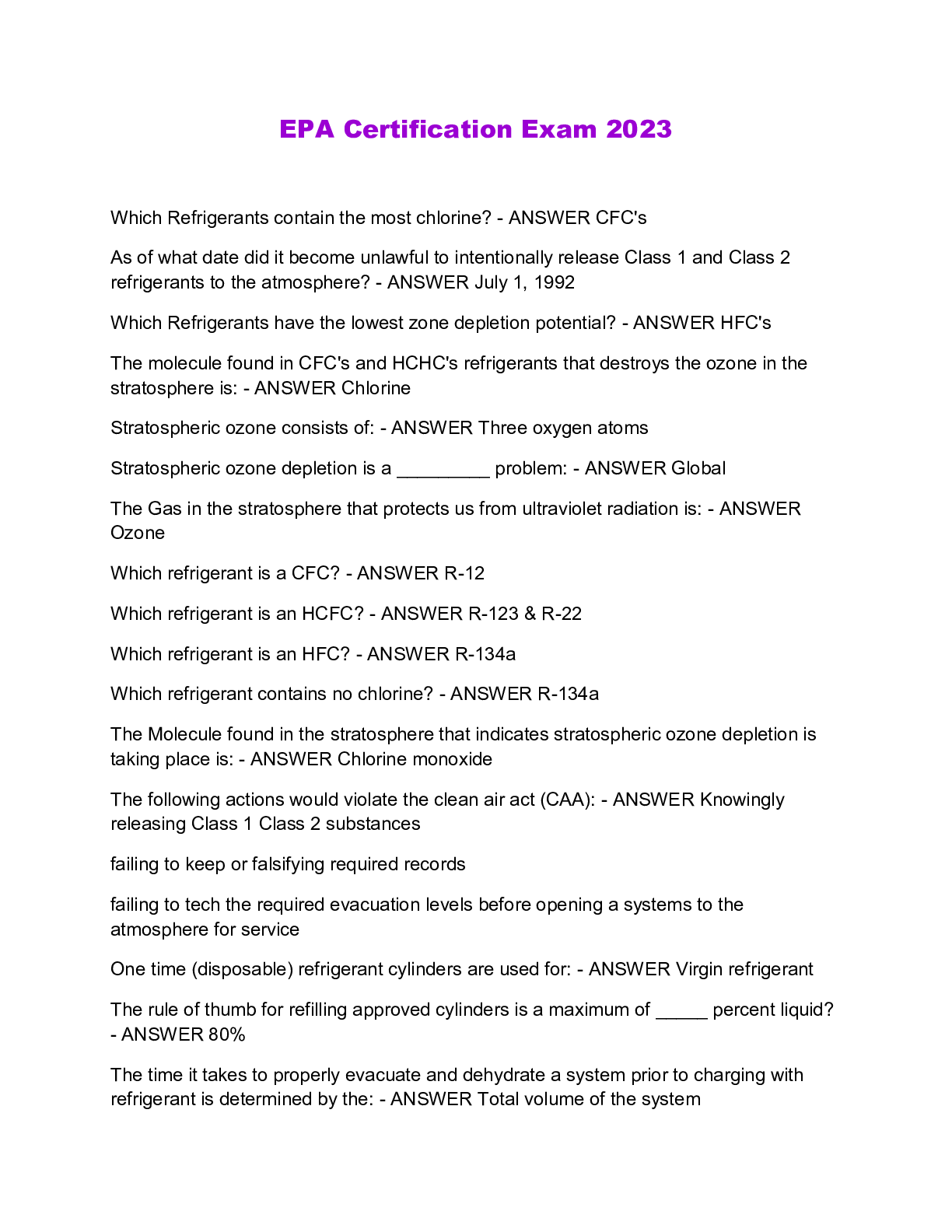 Engineering > QUESTIONS & ANSWERS > EPA 608 Certification, EPA 608 Exam 2023 (All)