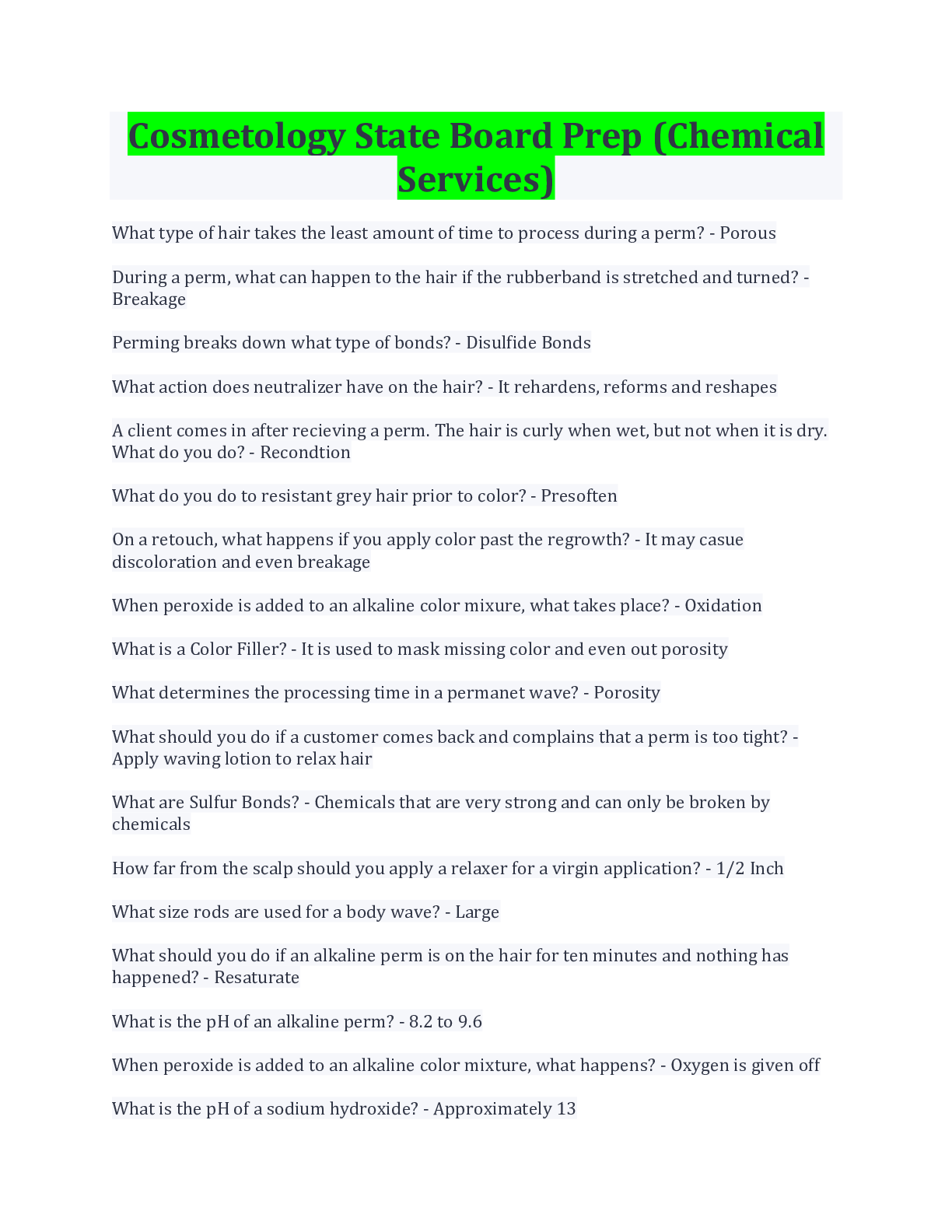 Dermatology > EXAM > Cosmetology State Board Prep (Chemical Services)2022 QUESTION AND ANSWERS (All)