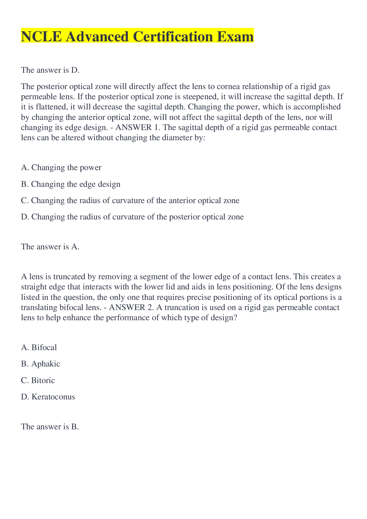 Optometry > QUESTIONS & ANSWERS > NCLE Advanced Certification Exam (All)