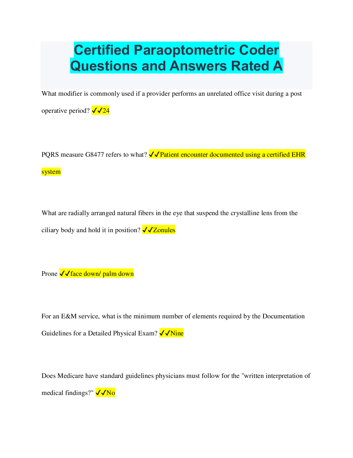 Optometry > QUESTIONS & ANSWERS > Certified Paraoptometric Coder Questions and Answers Rated A (All)