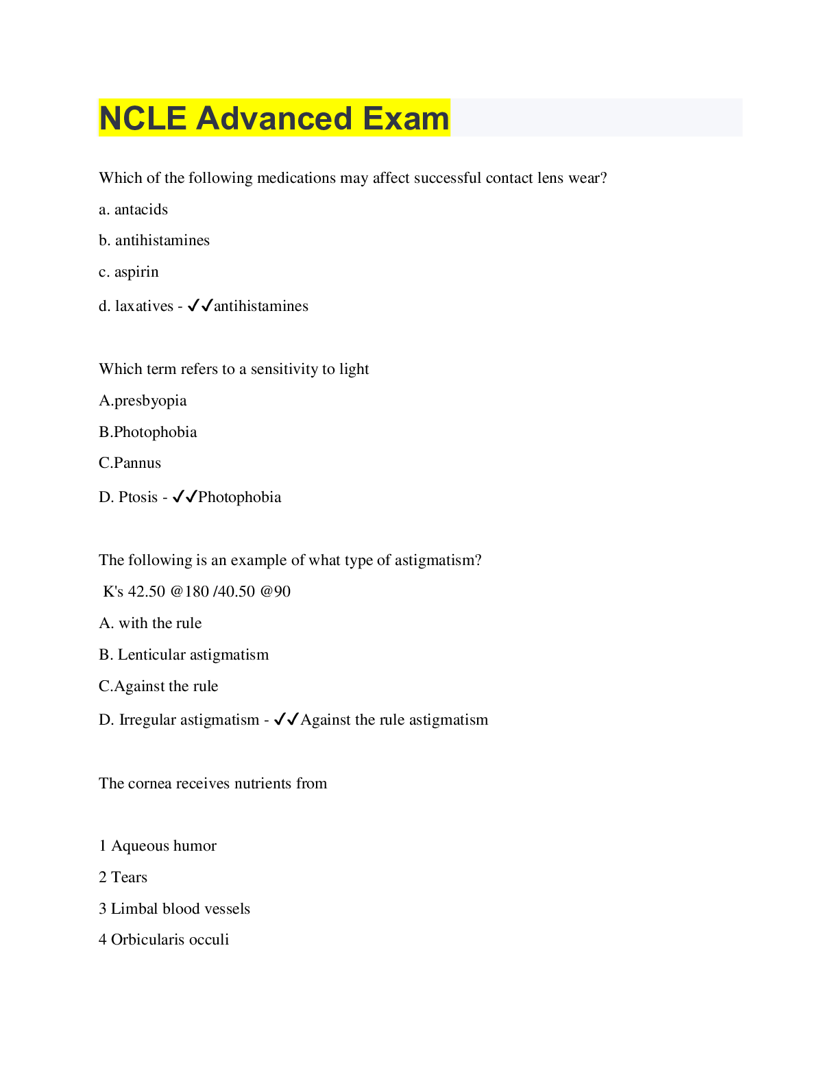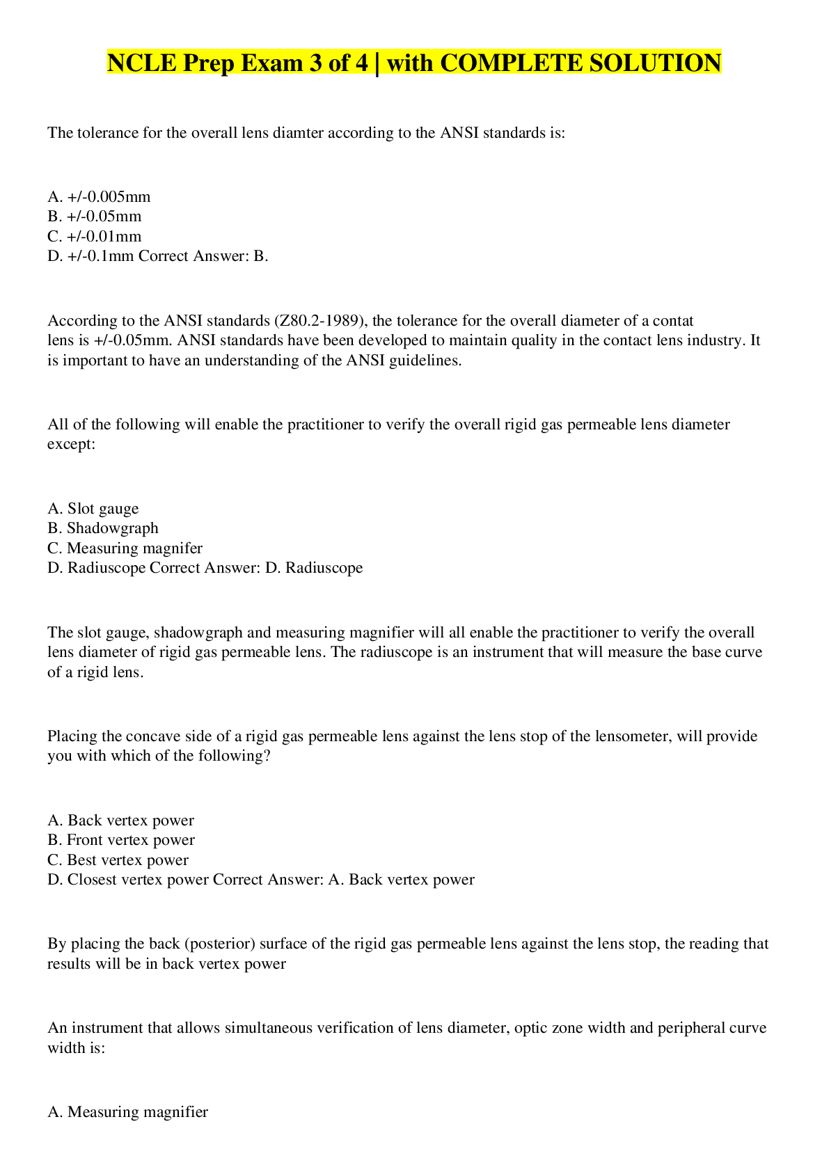 Optometry > QUESTIONS & ANSWERS > NCLE Advanced Exam Questions and Answers Rated A (All)