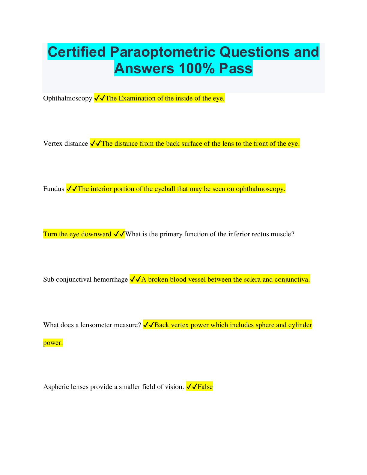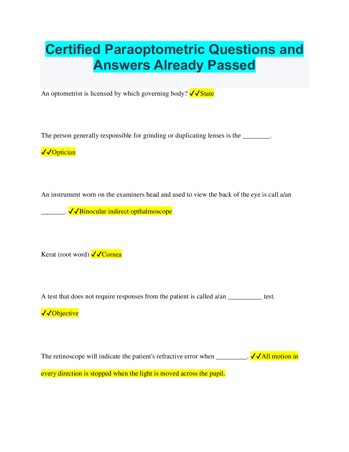 Optometry > QUESTIONS & ANSWERS > Certified Paraoptometric Questions and Answers Already Passed (All)