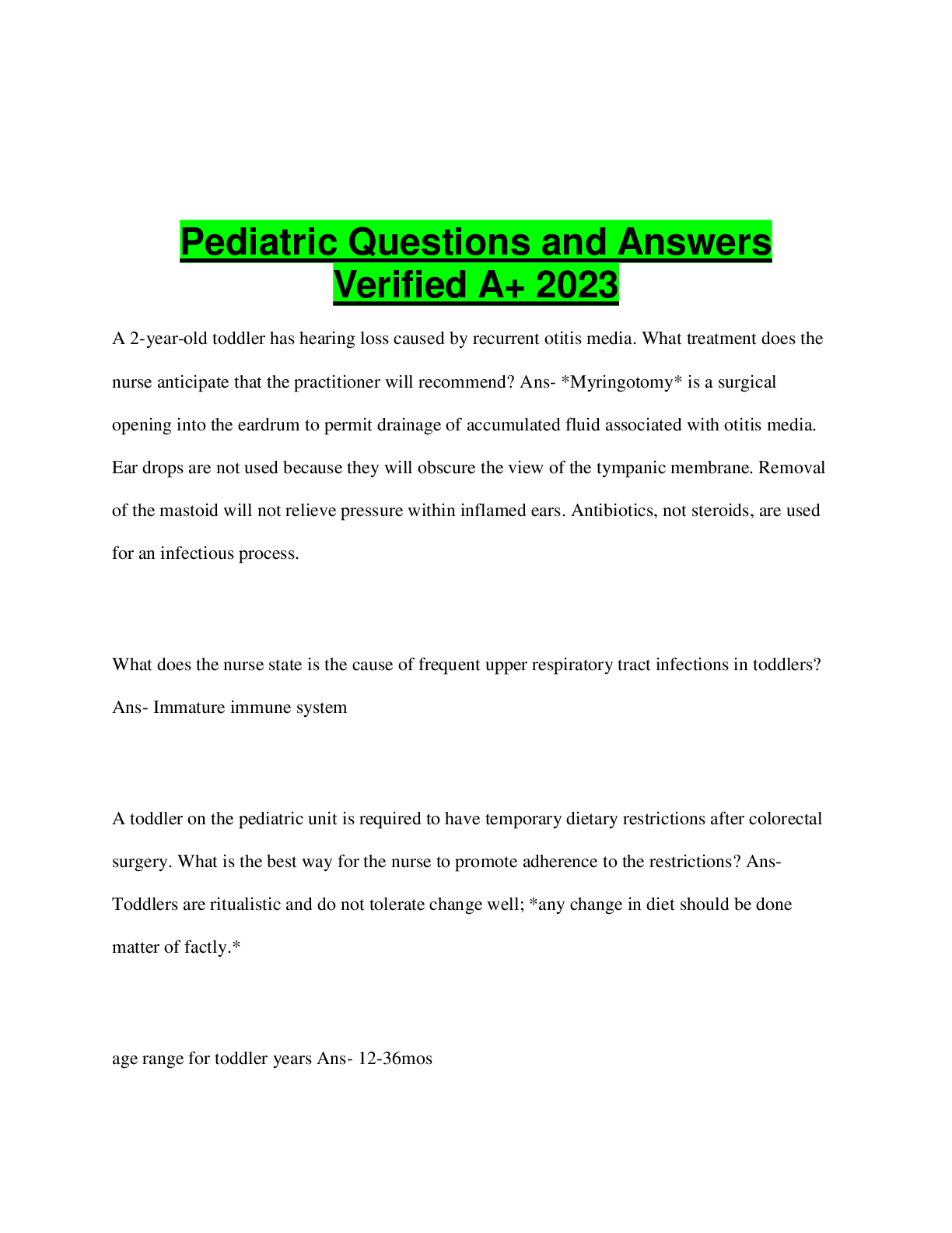 Paediatrics > EXAMs > Pediatric Questions and Answers Verified A+ 2023 (All)