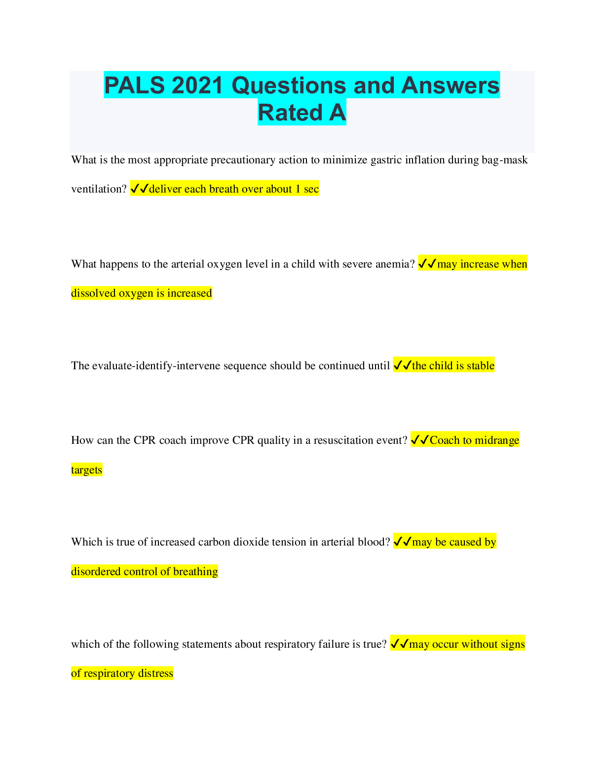 Paediatrics > QUESTIONS & ANSWERS > PALS AHA QUESTIONS AND ANSWERS RATED A (All)