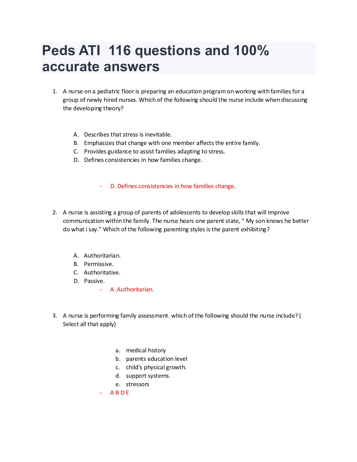 Paediatrics > EXAMs > Peds ATI 116 questions and 100% accurate answers (All)