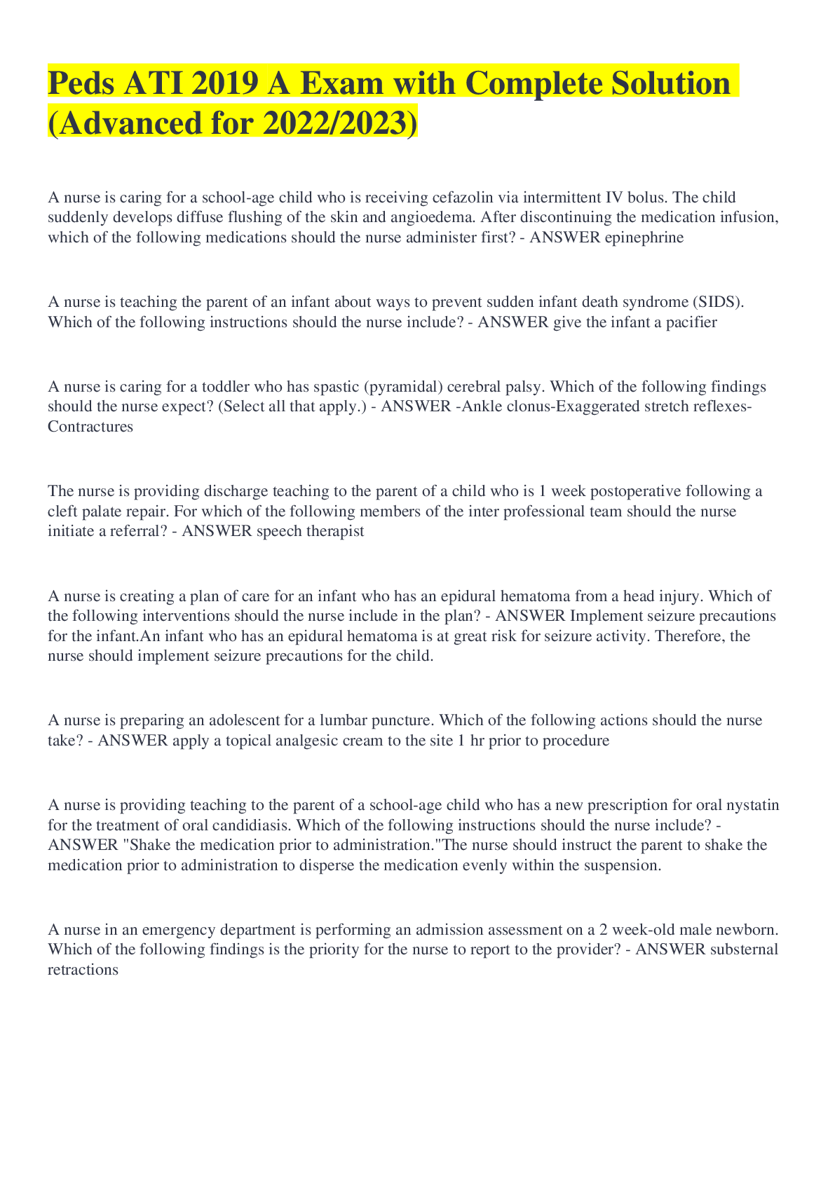 Paediatrics > ATI > Peds ATI 2019 A Exam with Complete Solution (Advanced for 2022/2023) (All)