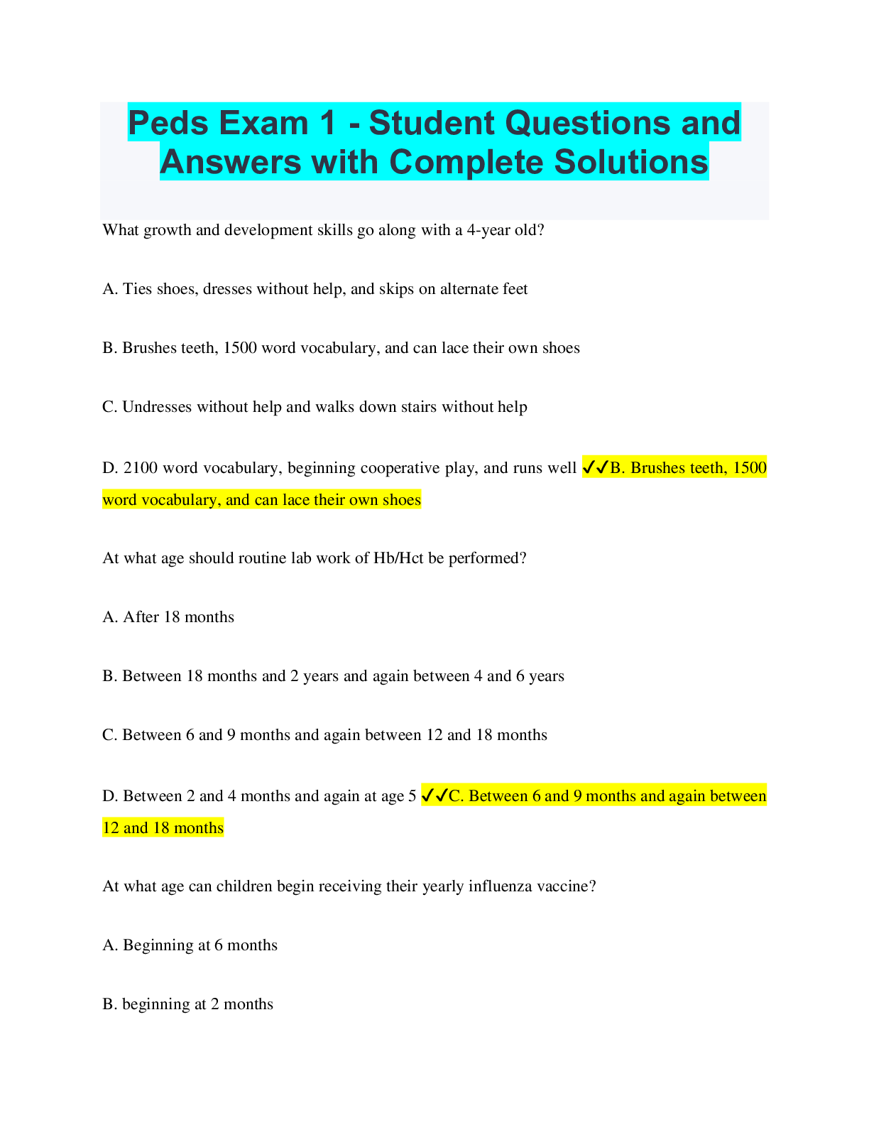 Paediatrics > QUESTIONS & ANSWERS > Peds Exam 1 - Student Questions and Answers with Complete Solutions (All)