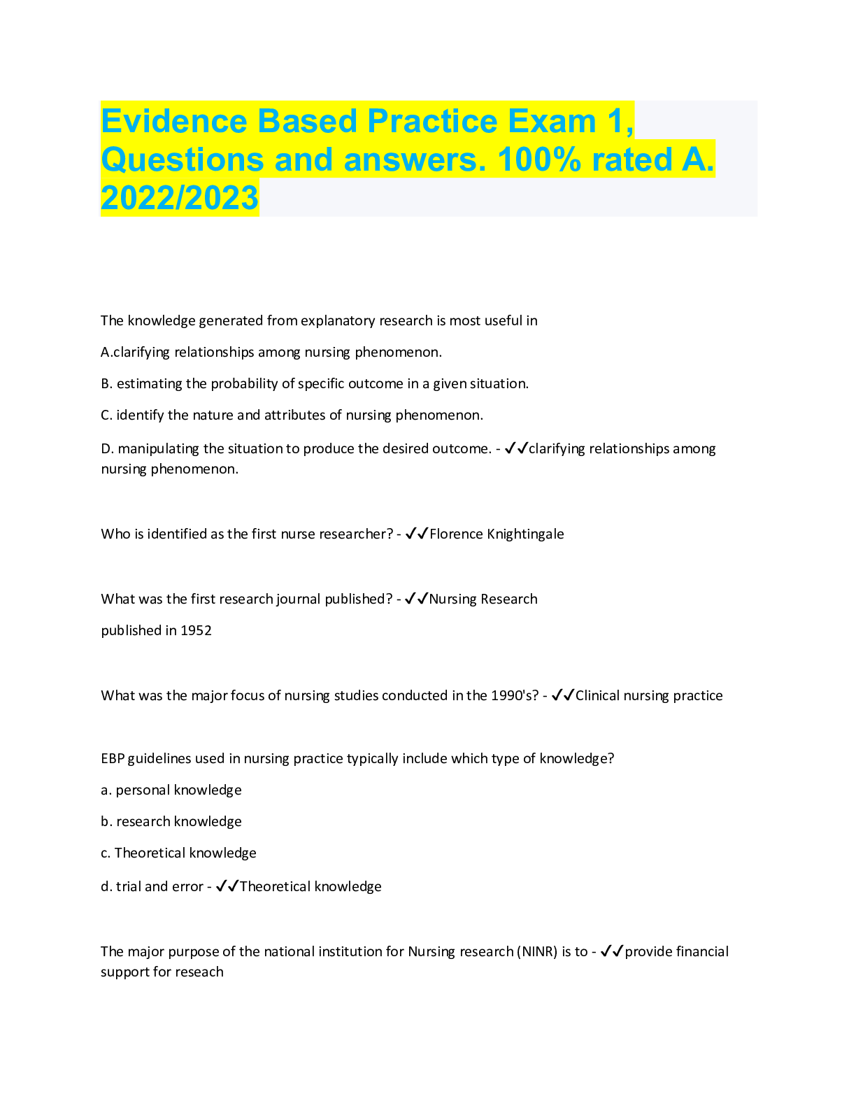Physical Therapy > QUESTIONS & ANSWERS > Evidence Based Practice Exam 1, Questions and answers. 100% rated A. 2022/2023 (All)