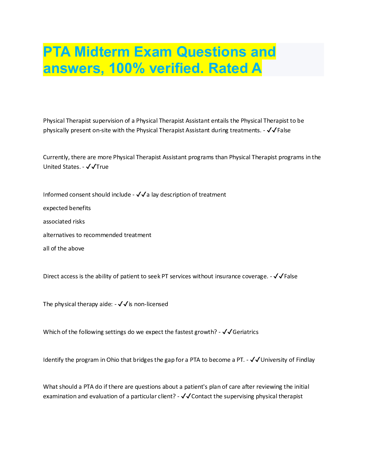 Physical Therapy > QUESTIONS & ANSWERS > PTA Midterm Exam Questions and answers, 100% verified. Rated A (All)