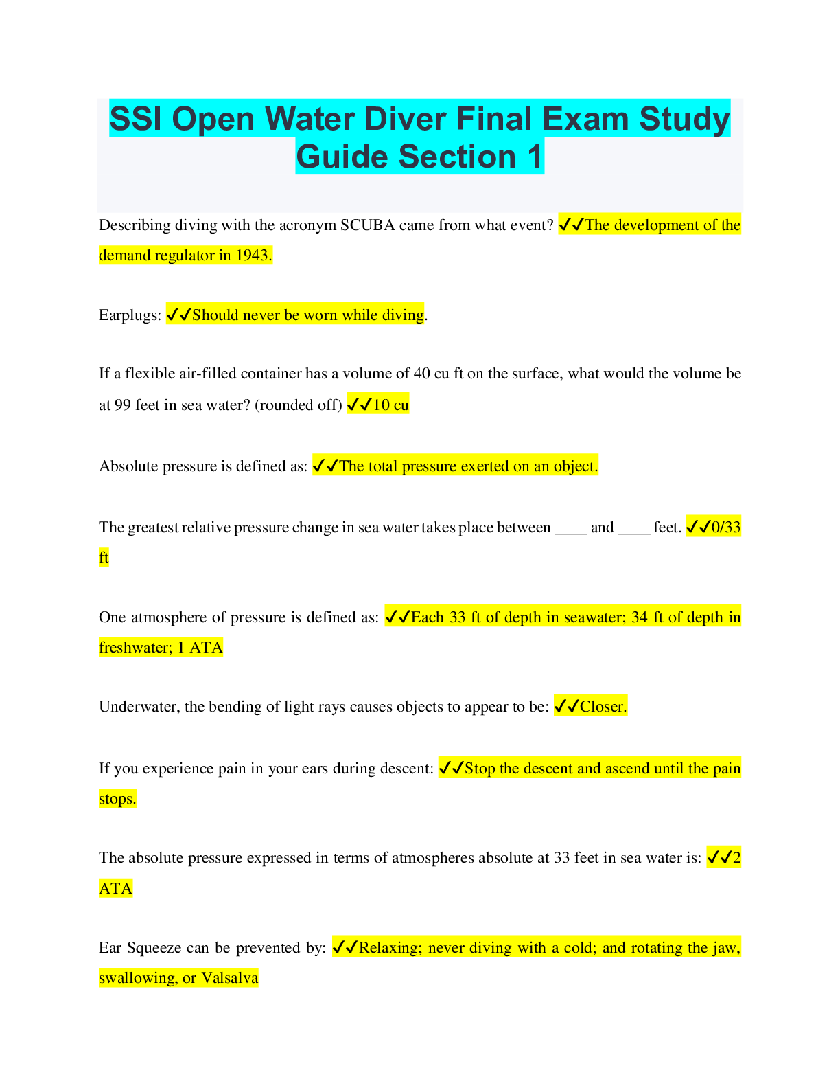 Physical Education > EXAM > SSI Open Water Diver Final Exam Study Guide Section 1 (All)