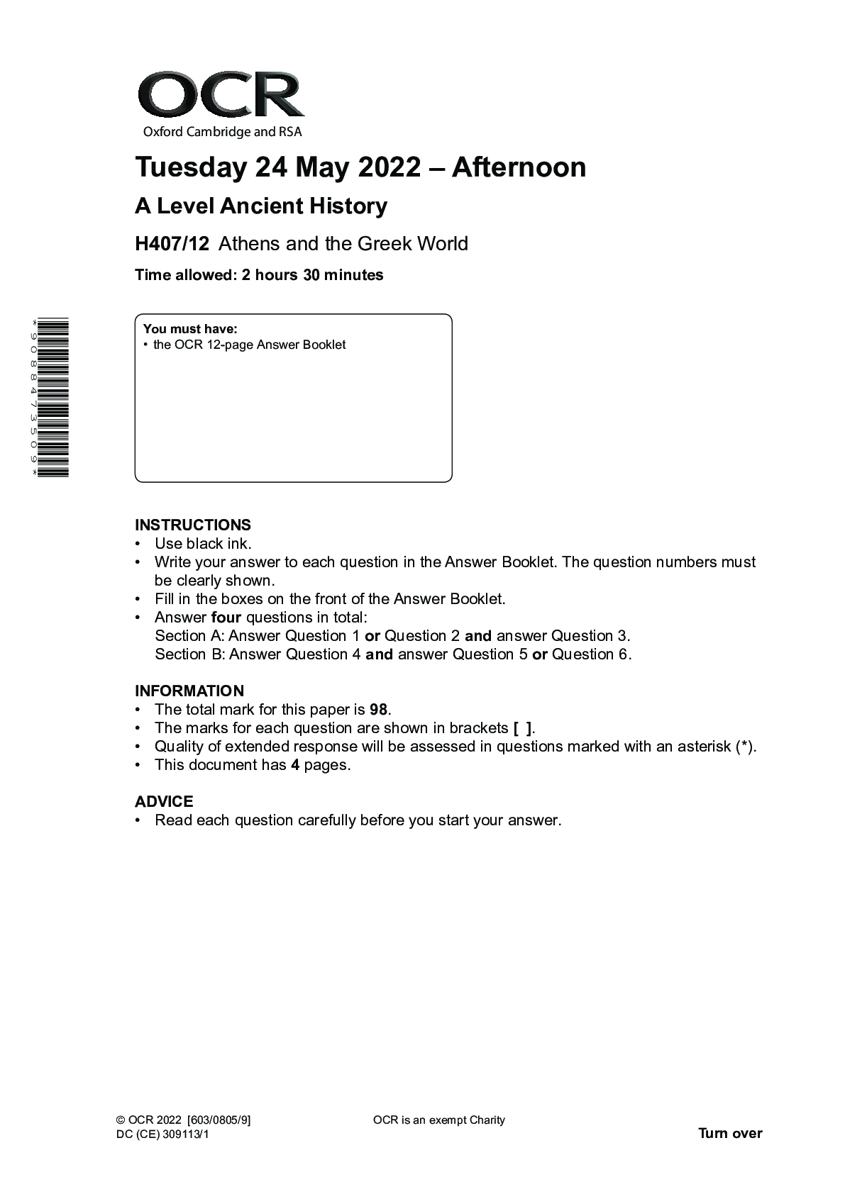 Ancient History > QUESTION PAPER & MARK SCHEME > OCR A Level Ancient History H407/12 Athens and the Greek World. QUESTION PAPER & MARKING SCHEME. RATED A+ (All)