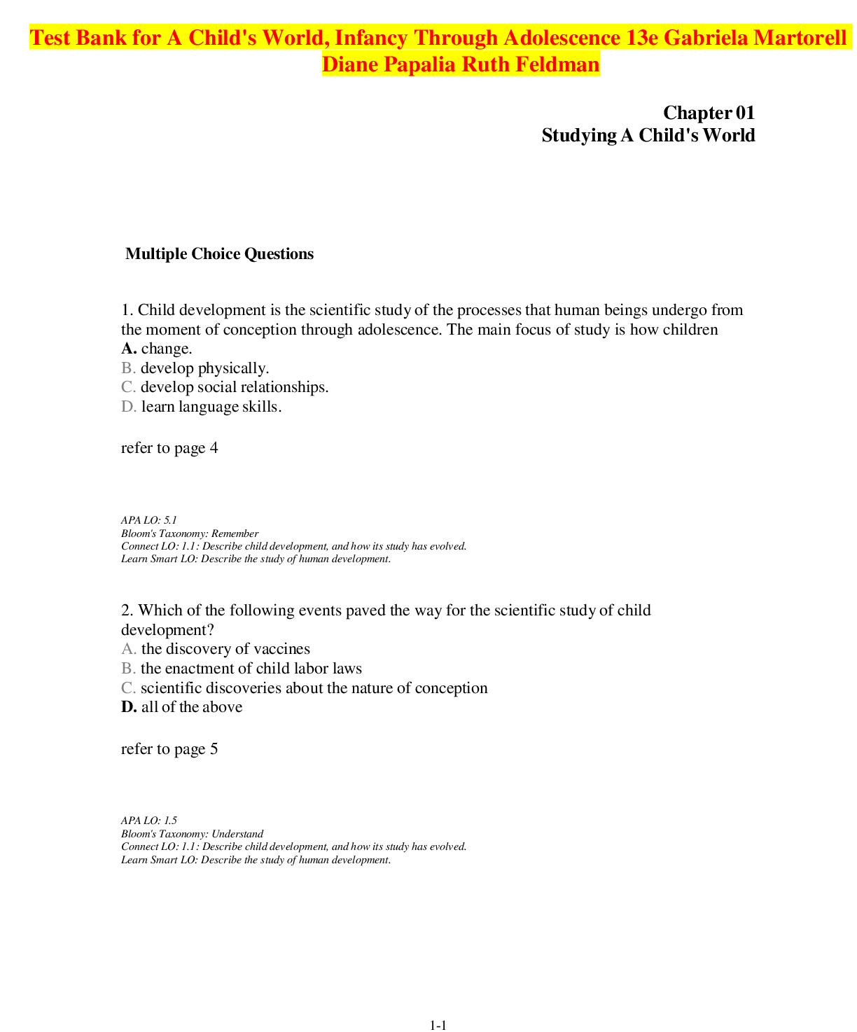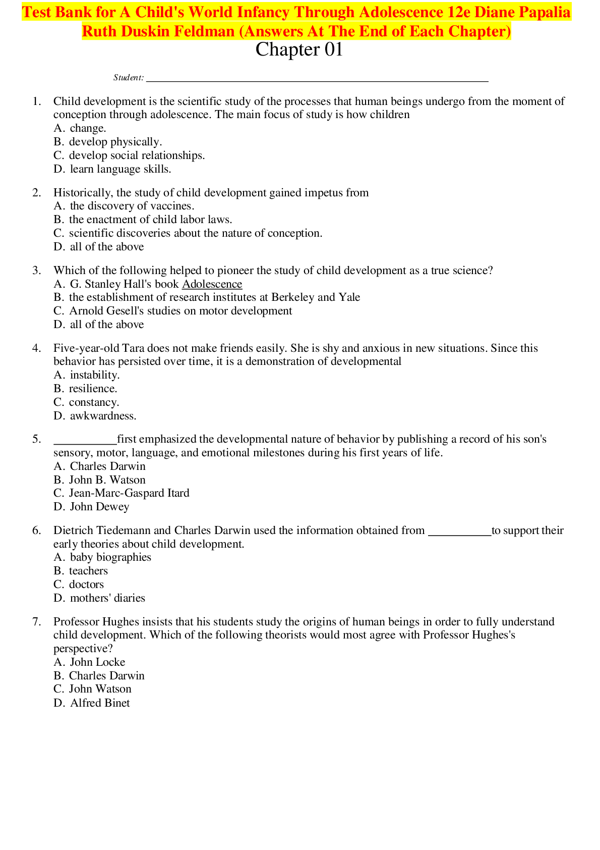 Child Learning and Development > TEST BANKS > Test Bank for A Child's World Infancy Through Adolescence 12th Edition by Diane Papalia Ruth Duskin Feldman A+ (All)